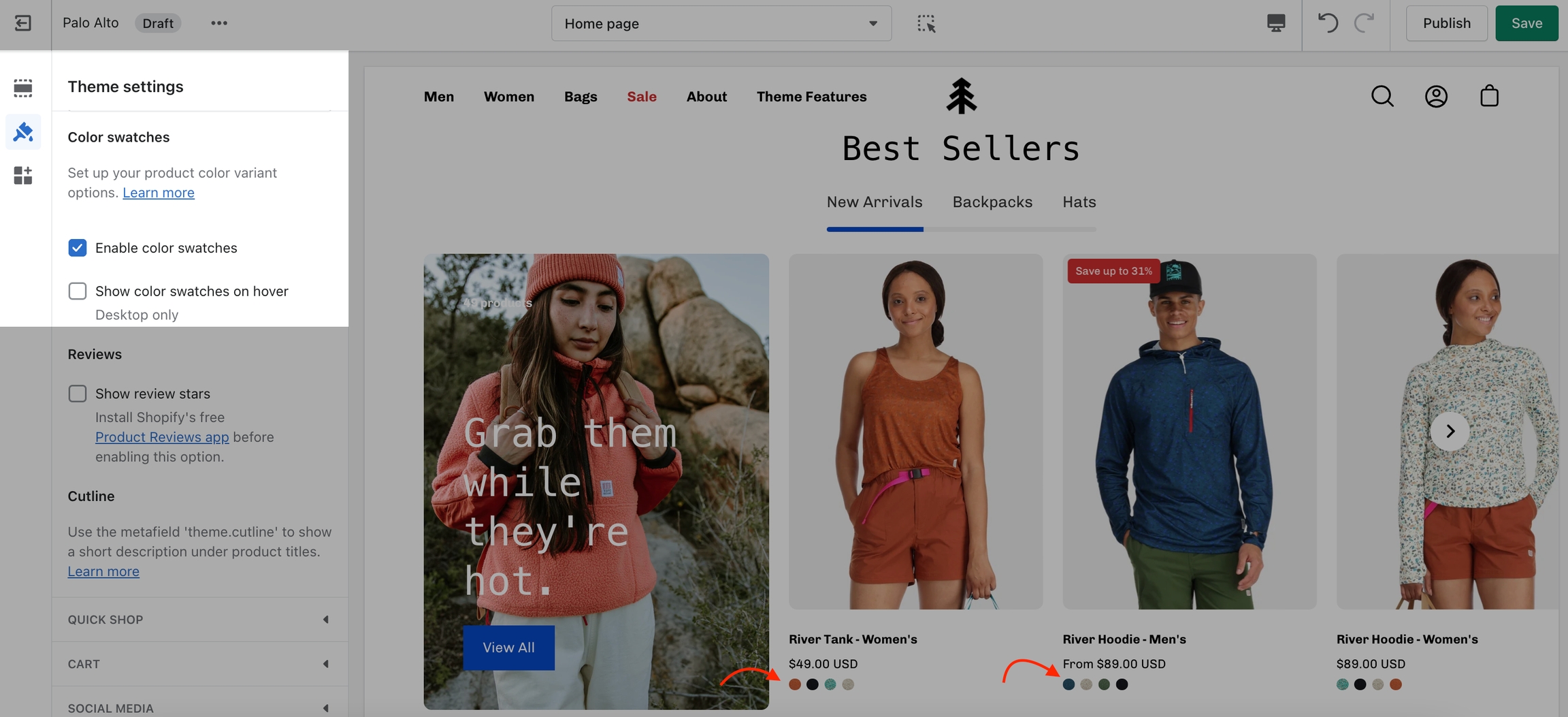 Under Swatches, you can toggle color swatches and enable them to be shown on hover (on Desktop only).
