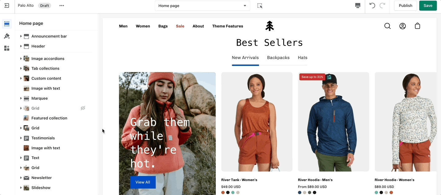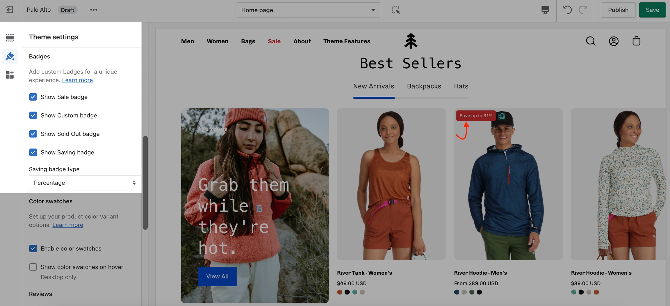 Under Badges, you can toggle the Sale, Custom, Sold out, and Savings badges. There is also the option to show savings in cash or as a percentage.