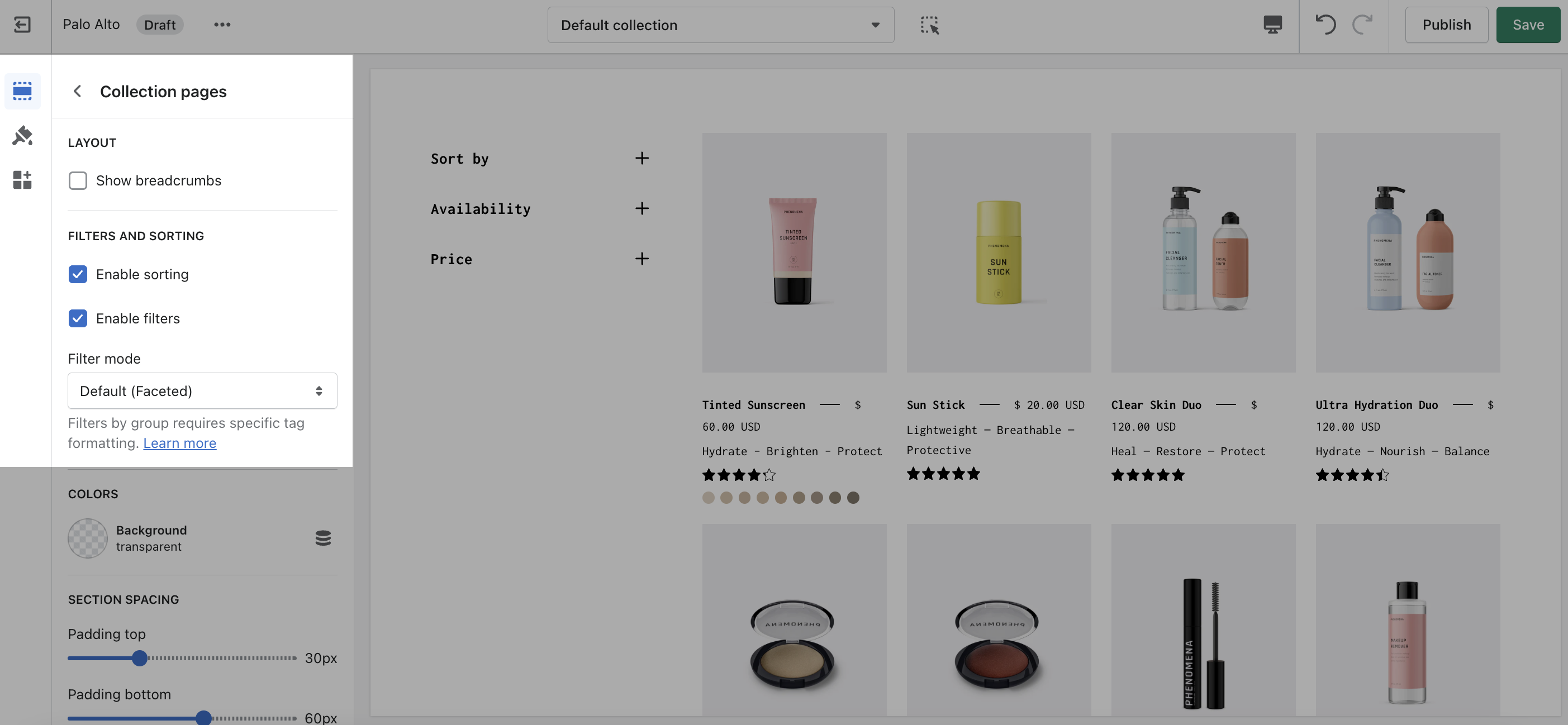 Palo Alto has three **filtering methods** to choose from. They can be found under the Collection products section settings.