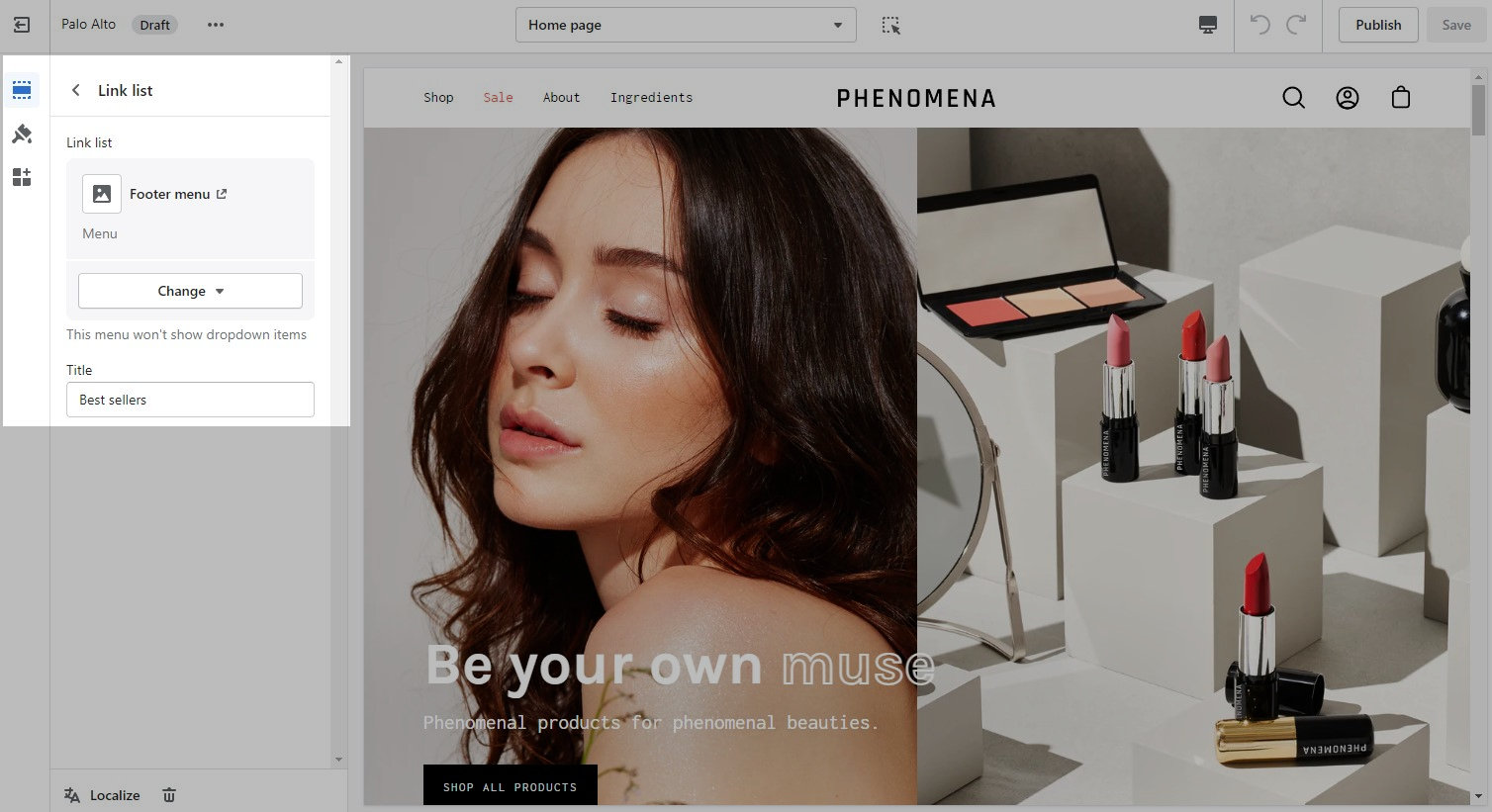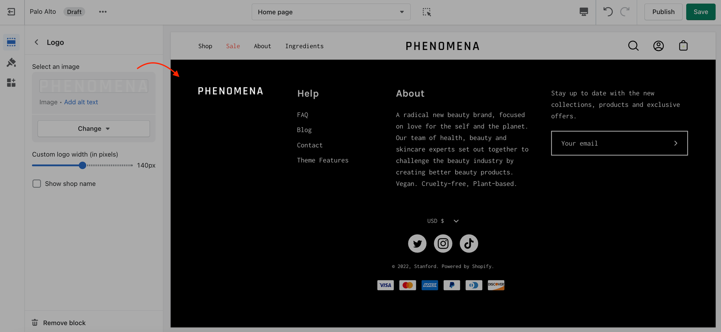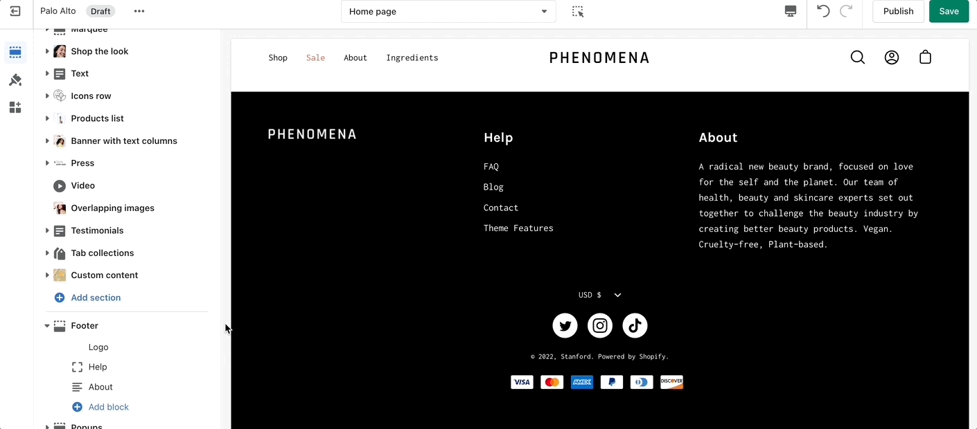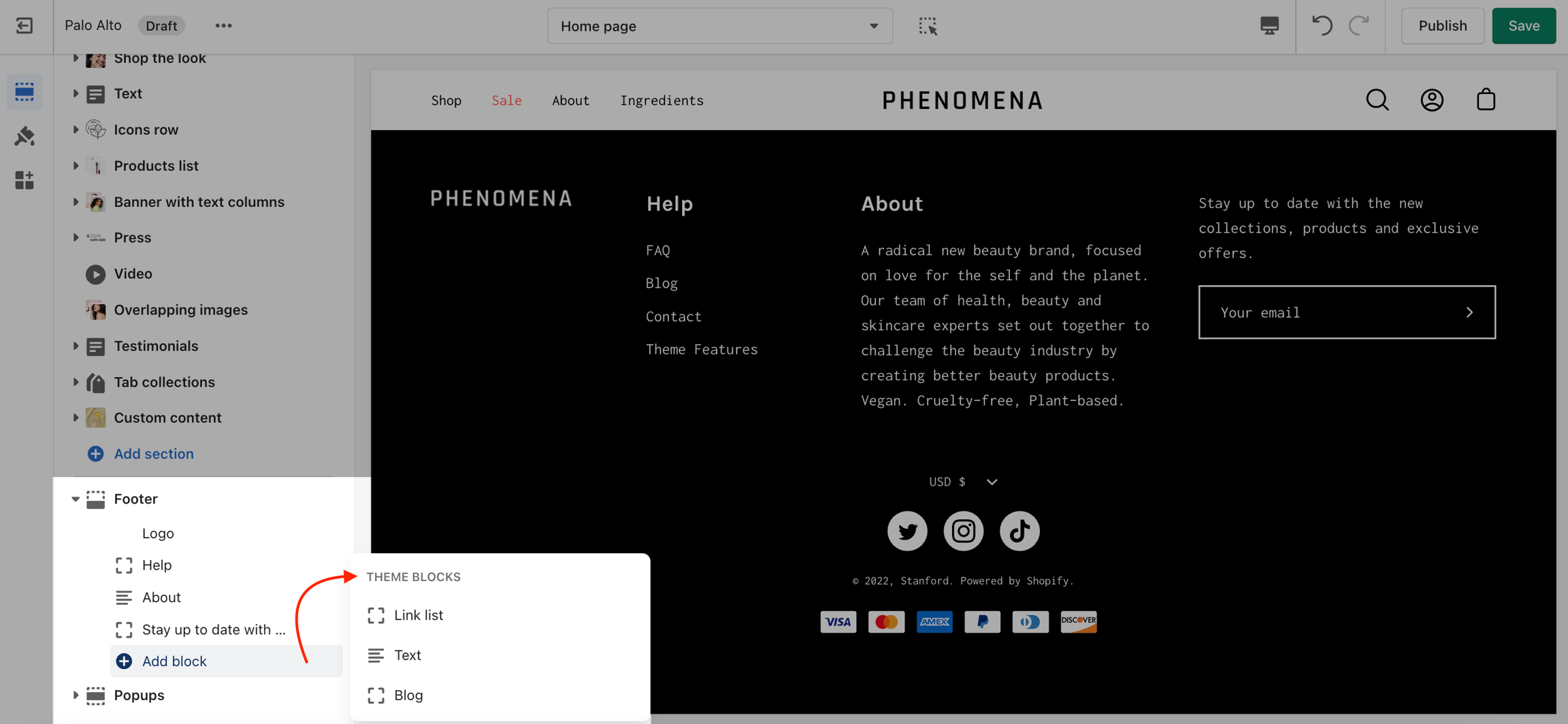 The Footer in Palo Alto has a lot of customizable elements in the form of section blocks. You can add in blocks by clicking the small arrow icon next to the Footer section then clicking the 'Add block' buttons: