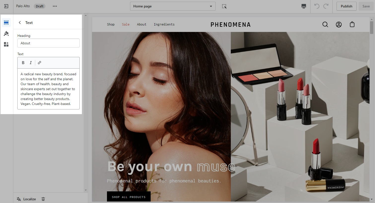 The logo block allows you to add an image (logo) and set its size. The image can be linked through a dynamic source to be shown differently on some pages (product pages, collection pages)