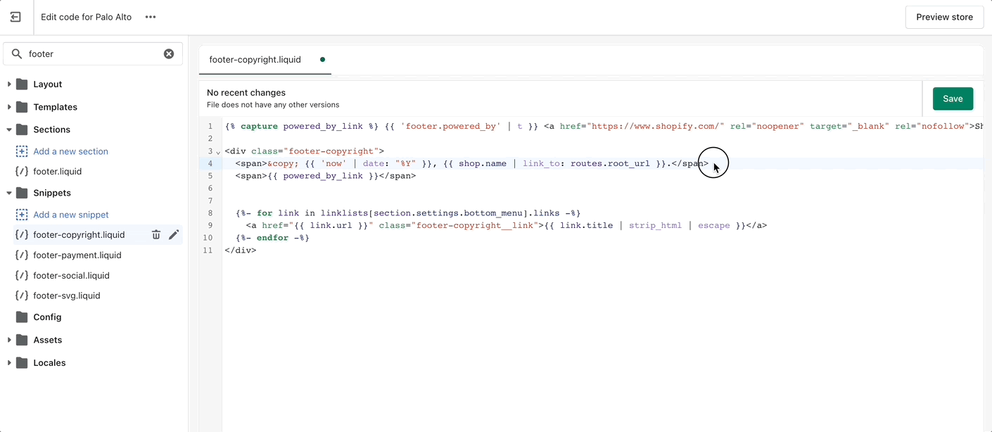 1. Open the `'footer-copyright.liquid'` file from the Snippets folder.