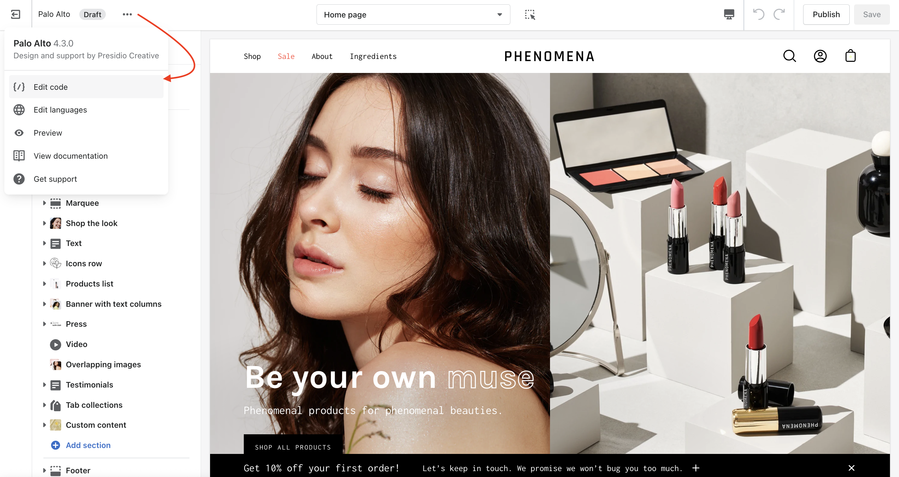 Click on the ellipses (three dots) icon at the top of the Theme Editor to view the theme actions and choose Edit code: