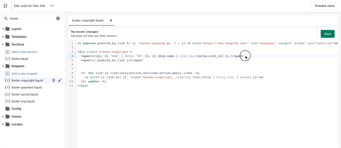 1. Open the 'footer-copyright.liquid' file from the Snippets folder.
