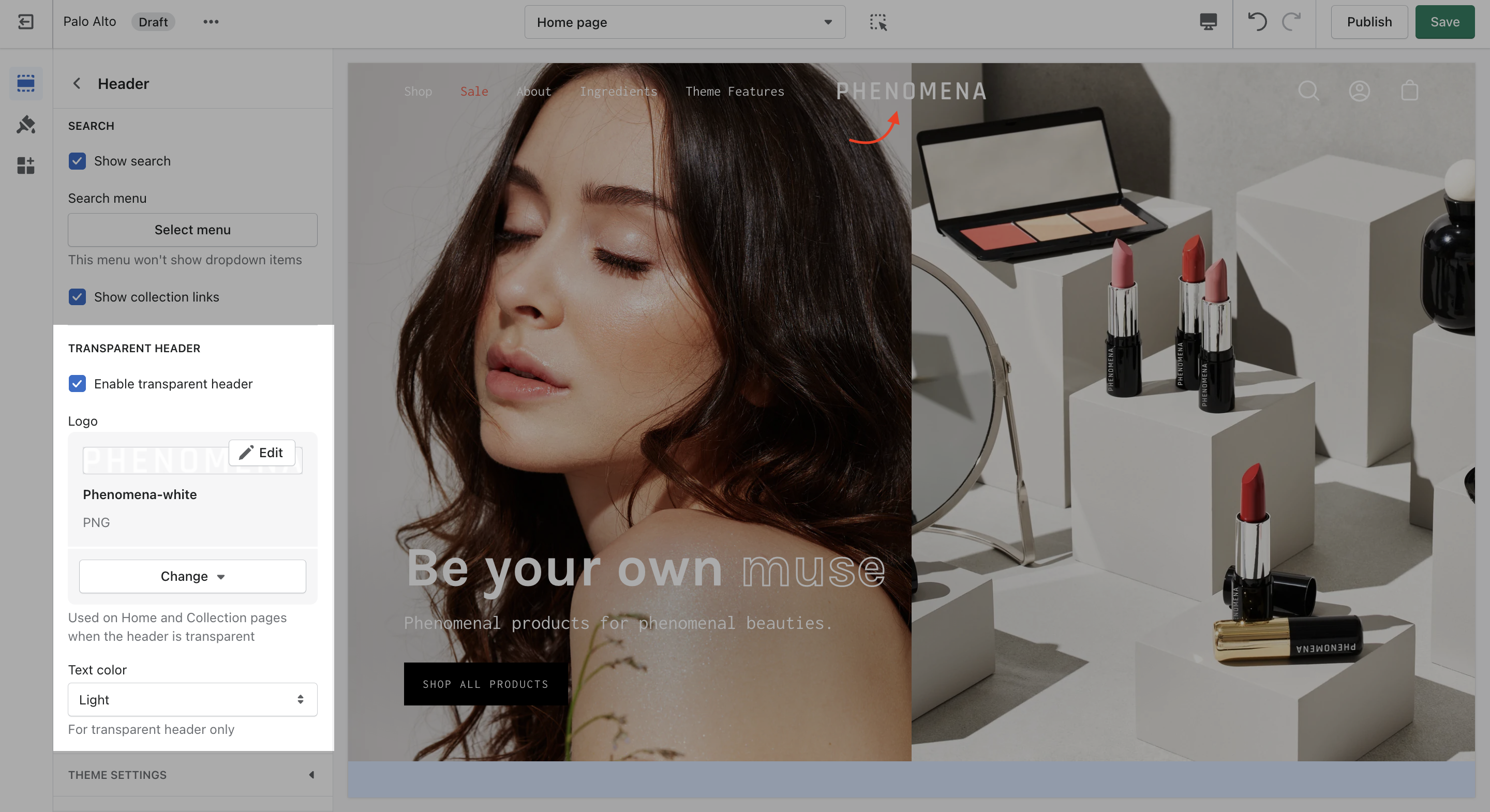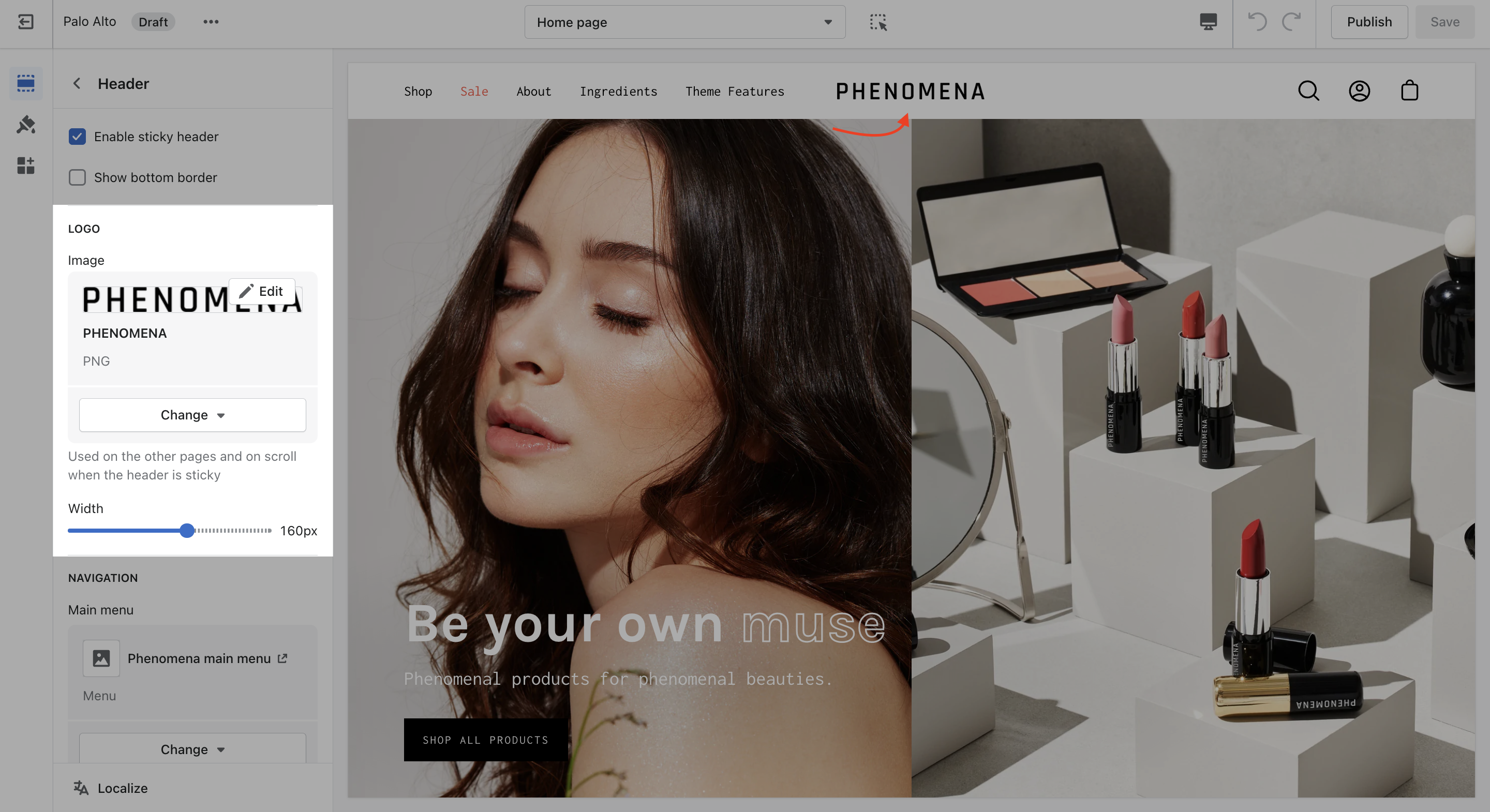 You can upload a logo in place of your store name by opening the Header section settings and uploading a **Custom logo**: