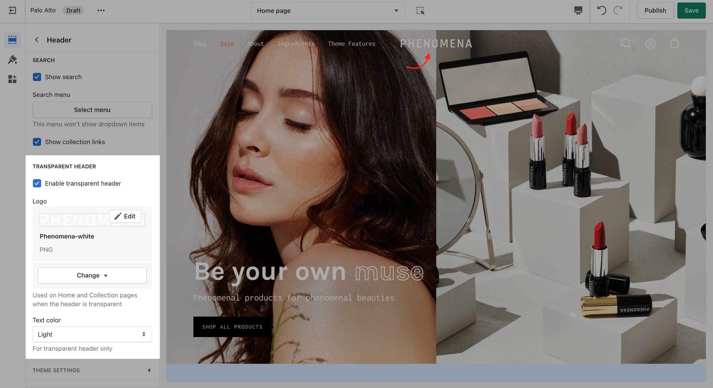 You can upload a logo in place of your store name by opening the Header section settings and uploading a Custom logo:
