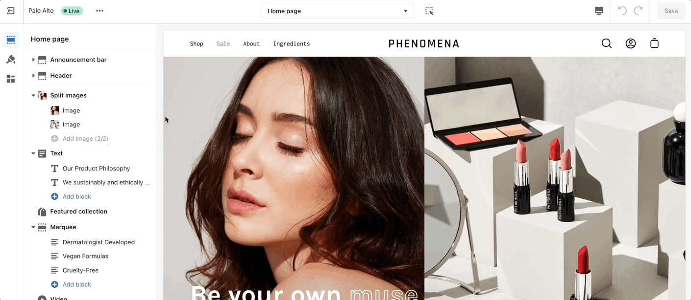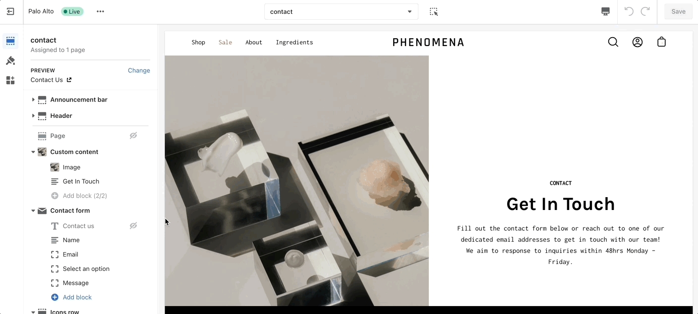 You can start customizing the page with the pre-defined sections included in Palo Alto. You can hide, reorder, remove sections that are included and also add any new selection from Palo Alto's list of over 25+ sections.