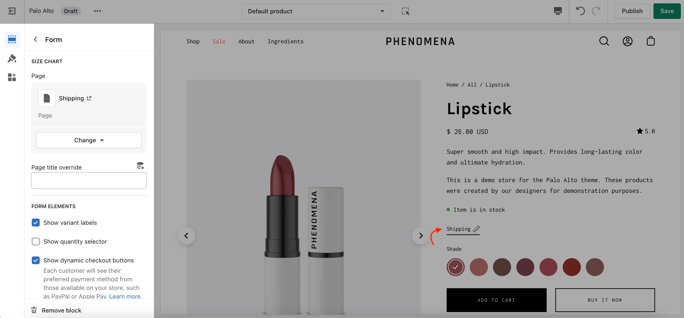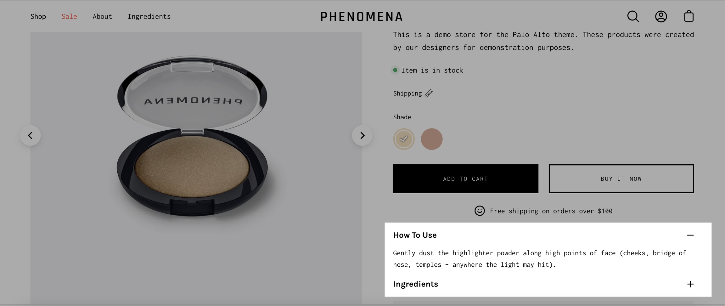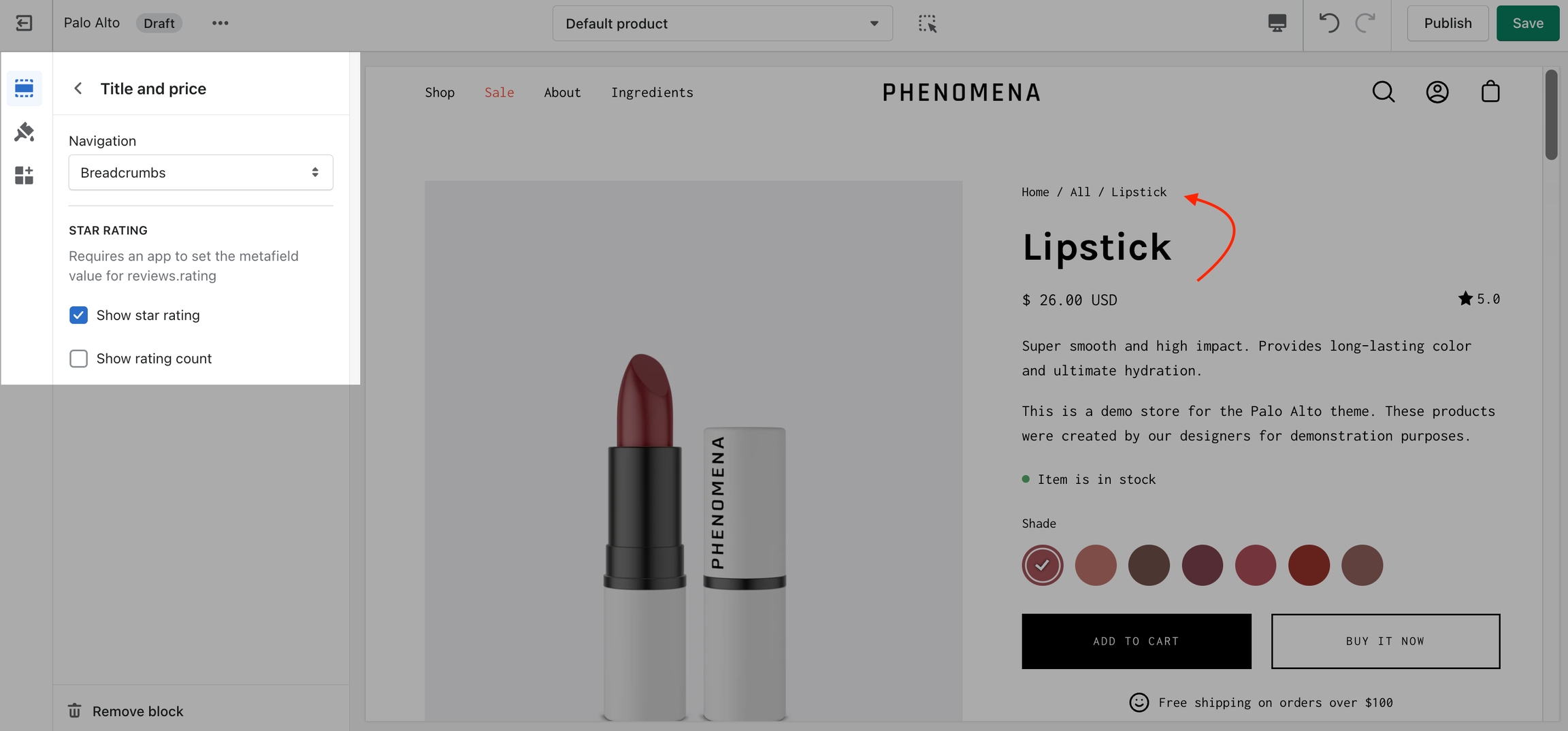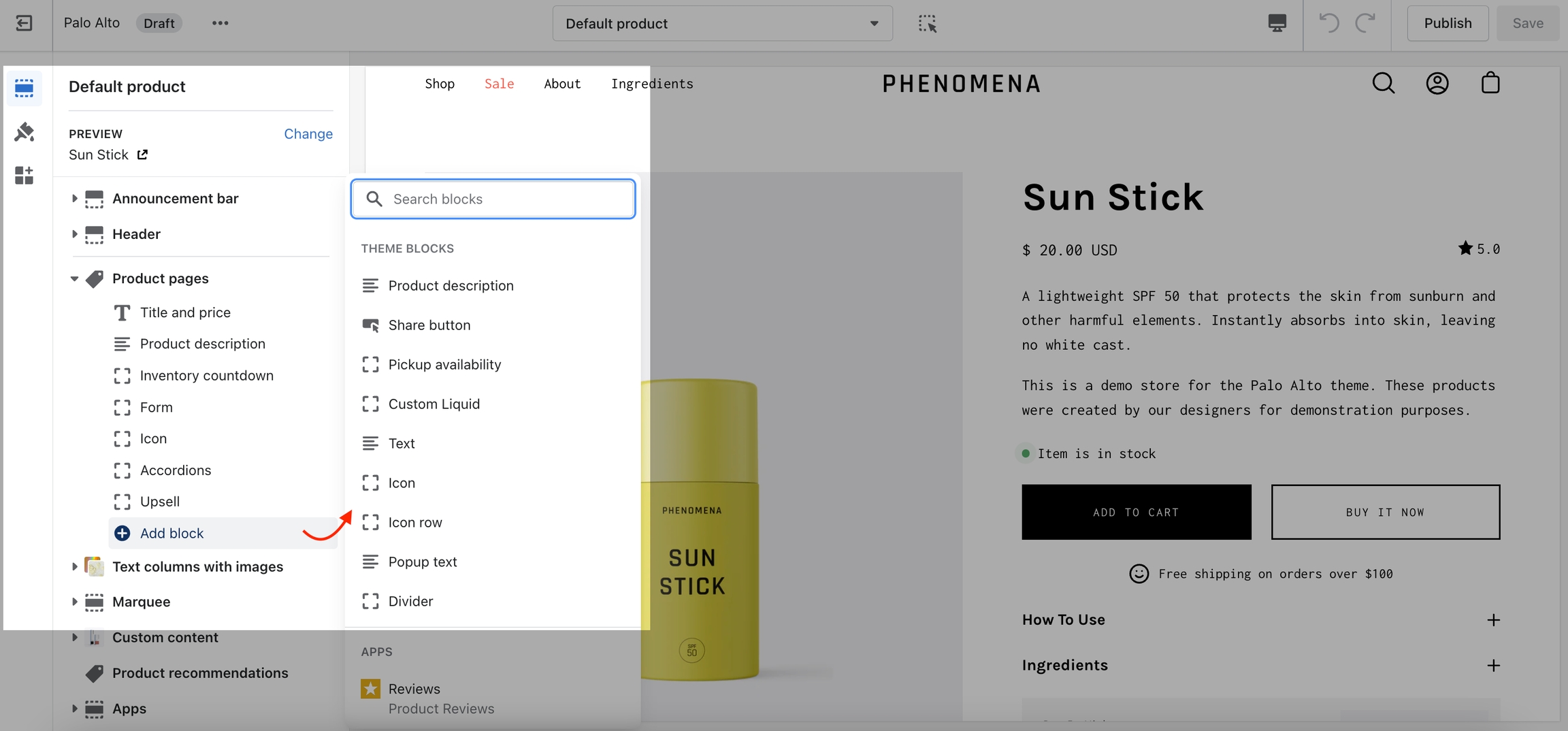 The Palo Alto 'Product pages' section blocks help you customize the primary or core content for your product pages and product templates. Adding sections further enhances your merchandising.