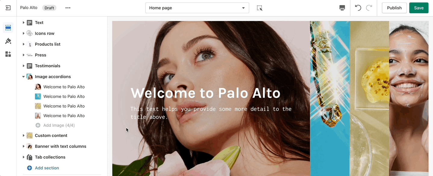 One of our newest sections, Image accordions, allows you to set a unique look and showcase multiple images that reveal more information as you hover over them.