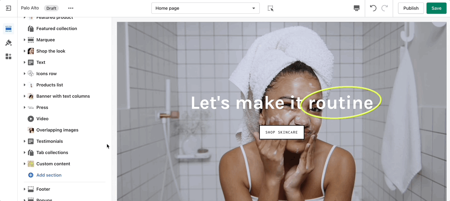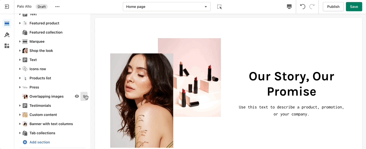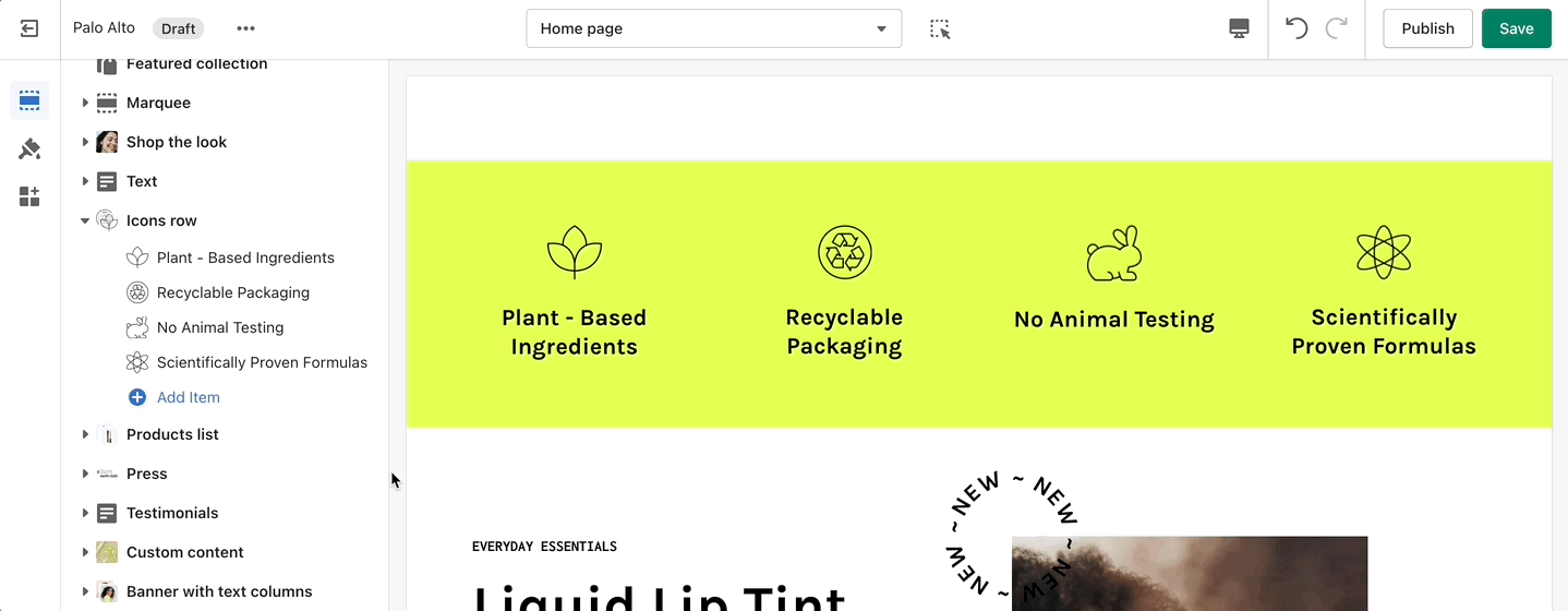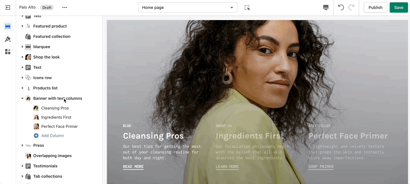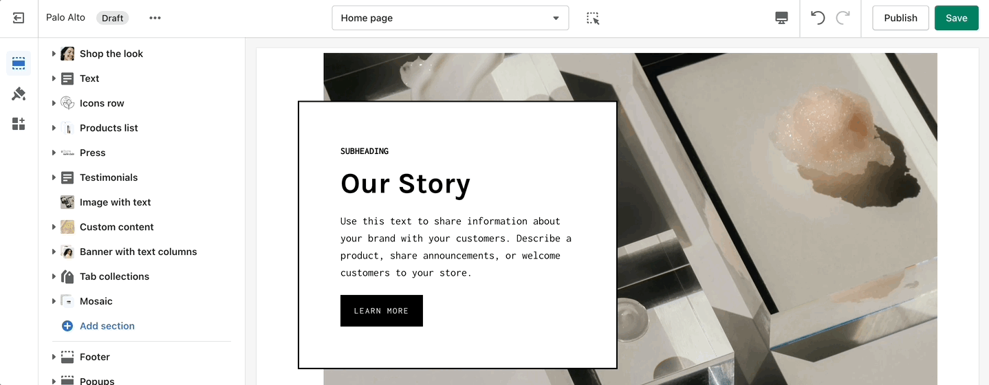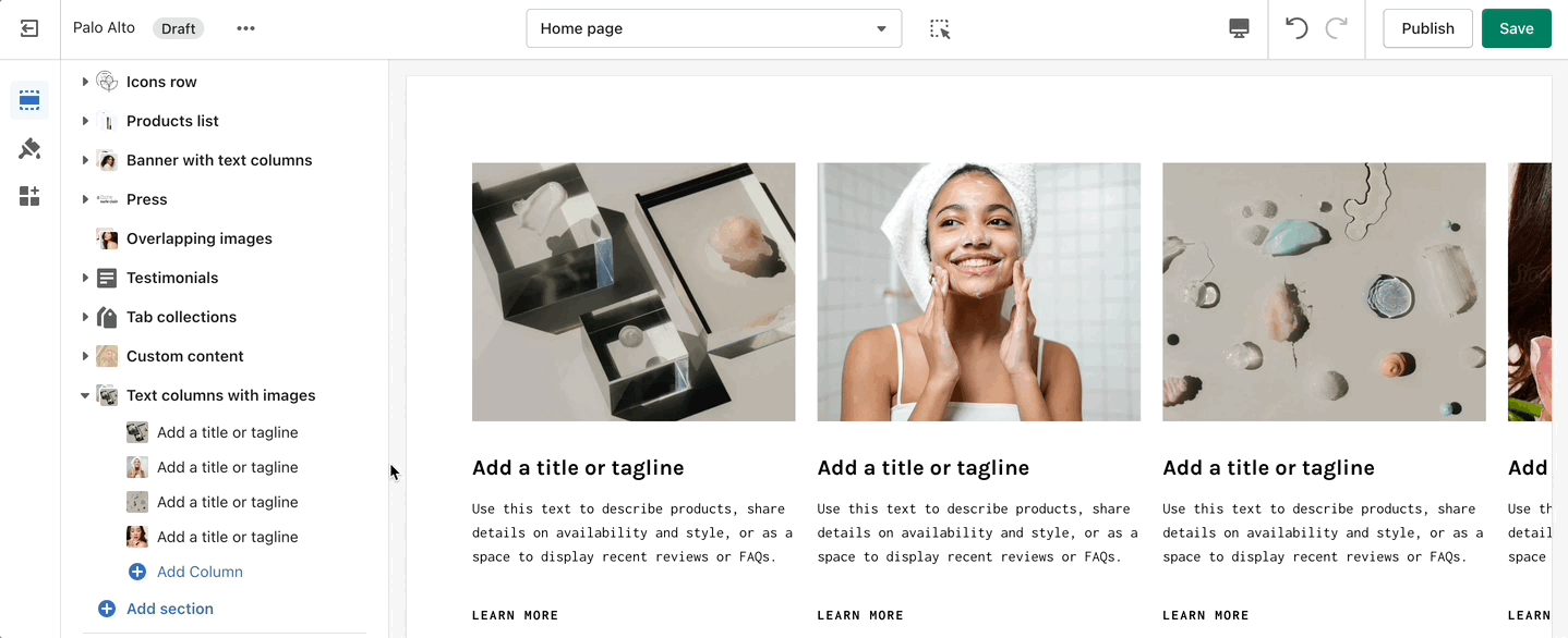 Inspired by the blog posts section, 'Text collums' allows you to create your own highlights from the theme editor without having the need to create blog posts.
