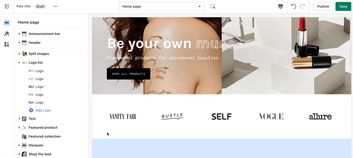 'Logo List' creates a carousel view that you can use to showcase your brand or partnered brand logos.