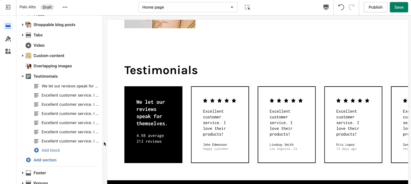 Add a heading and set the colors, alignment, and navigation style of this section. Add individual testimonial blocks to the section.
