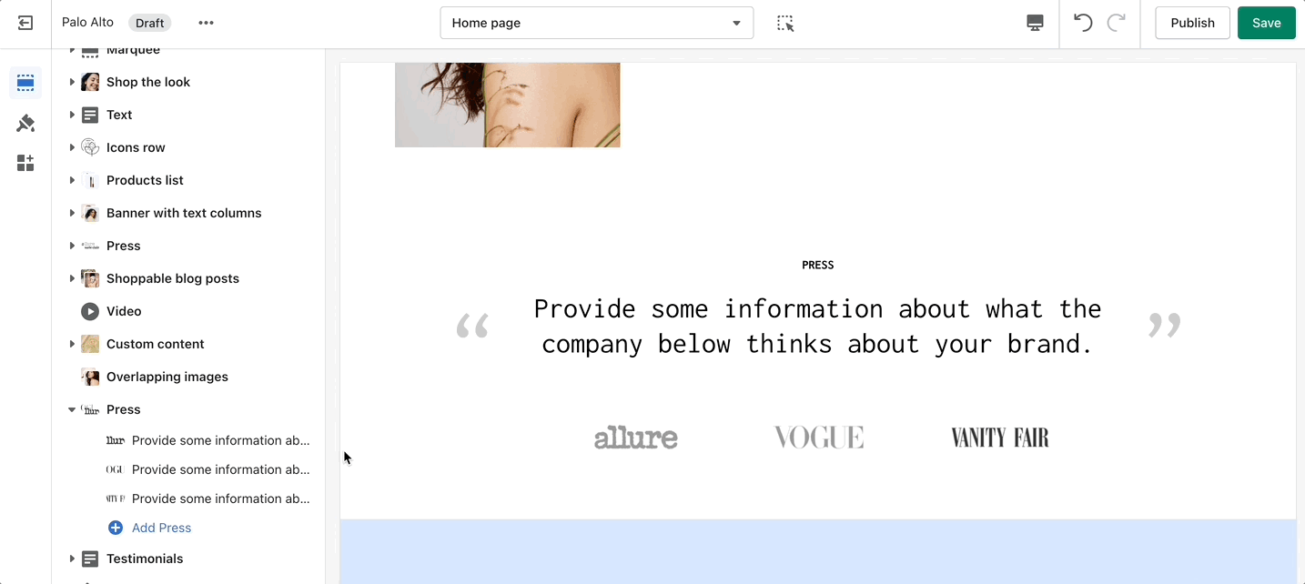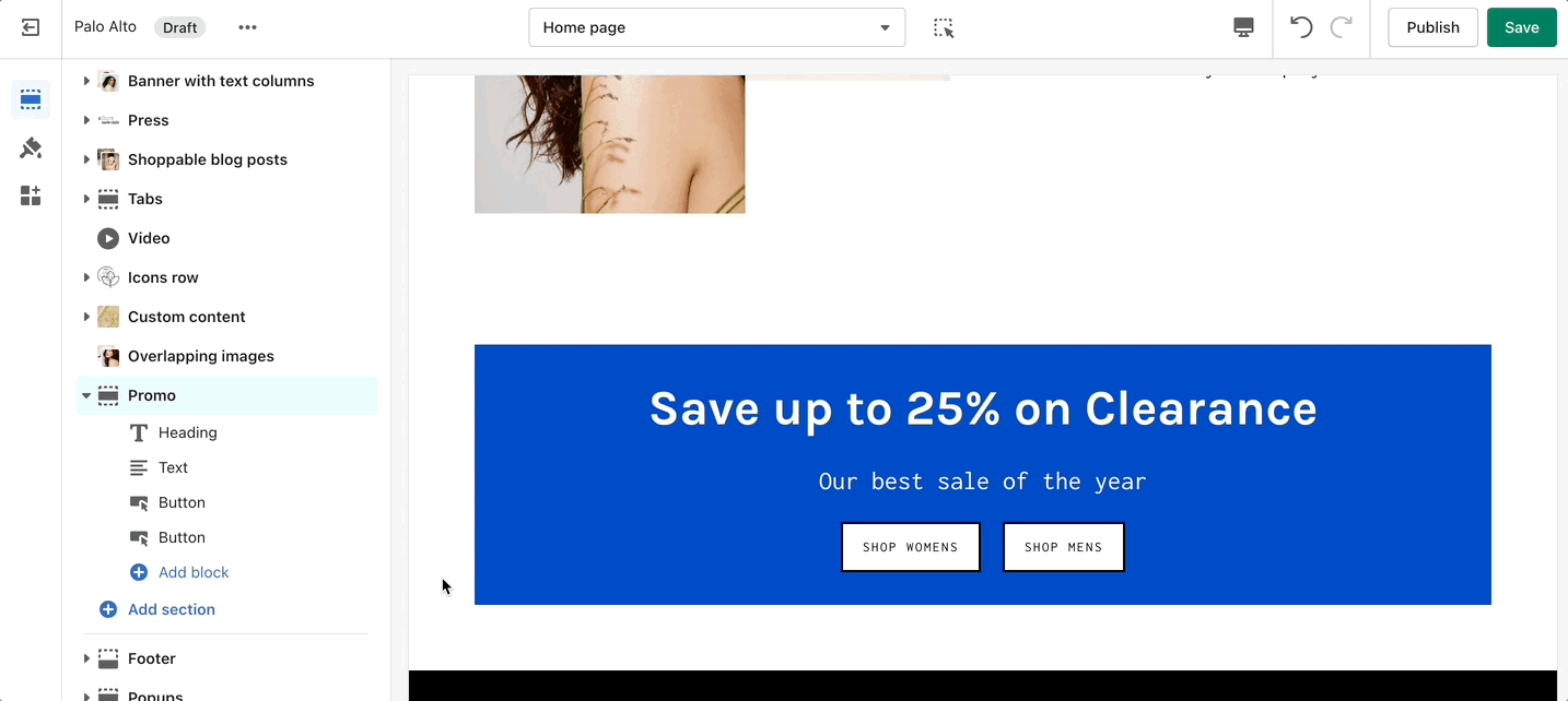 Use the 'Promo' section to add a simple banner image with text and promote to customers as they scroll along the page.