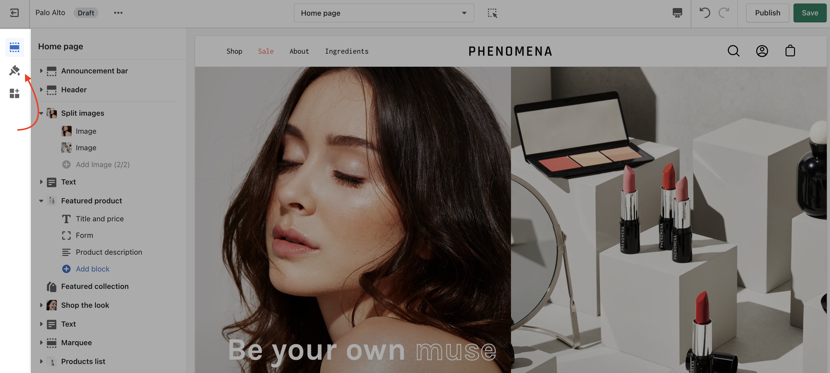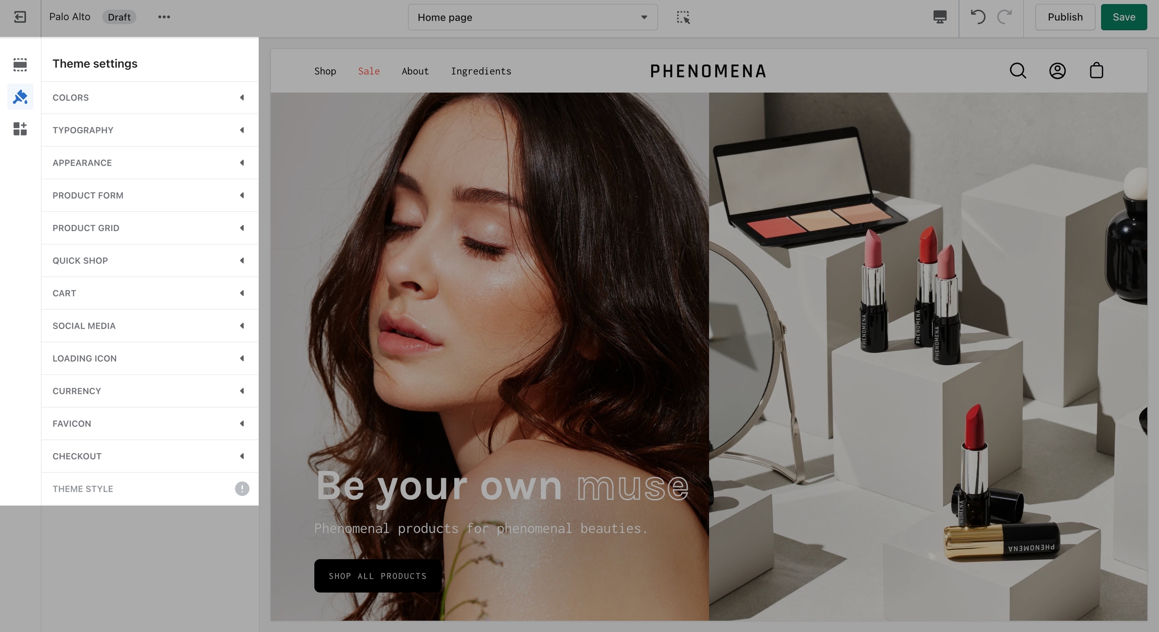 The 'Theme Settings' tab is set off to the left side in the Theme Editor. This tab contains a bundle of all global settings in Palo Alto.