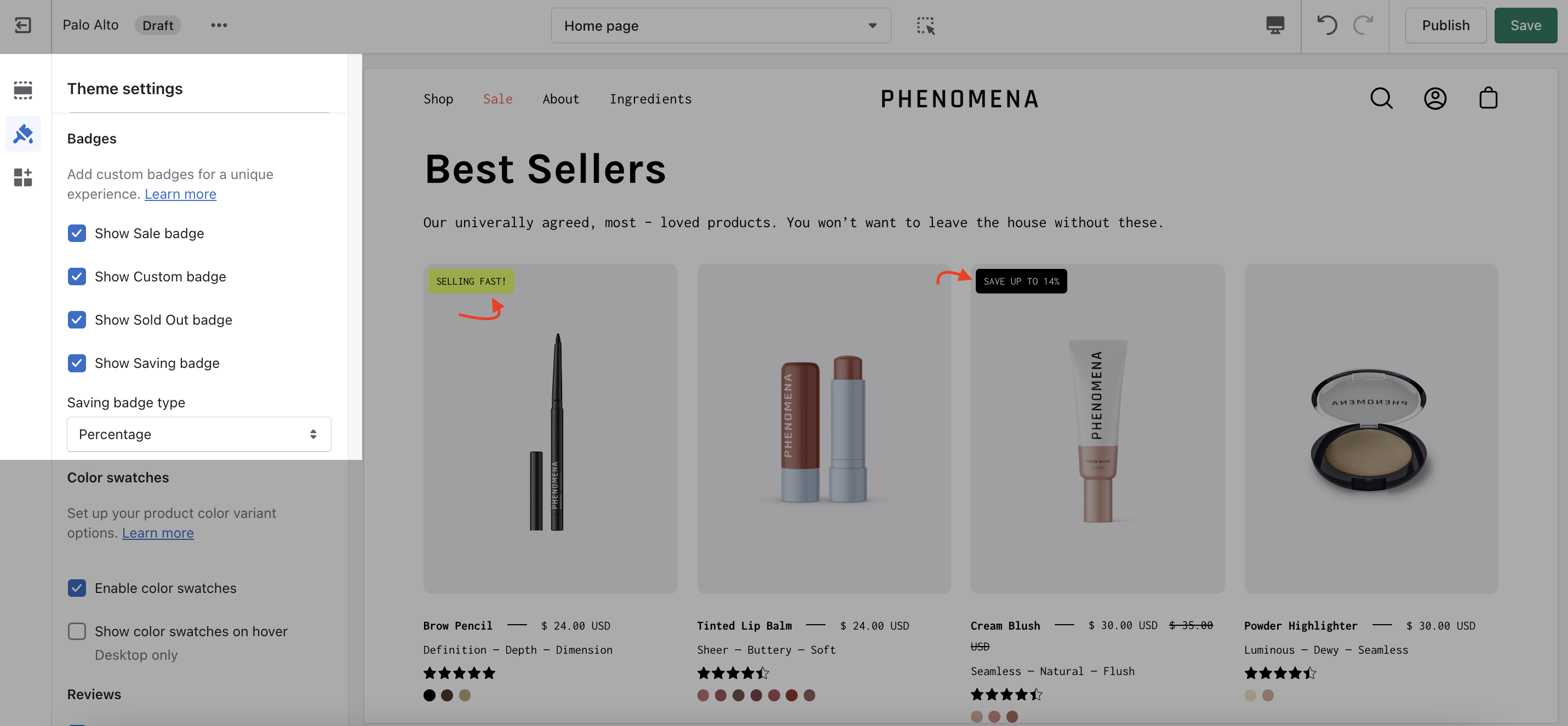 Under **Badges**, you can toggle the Sale, Custom, Sold out, and Savings badges. There is also the option to show savings in cash or as a percentage.