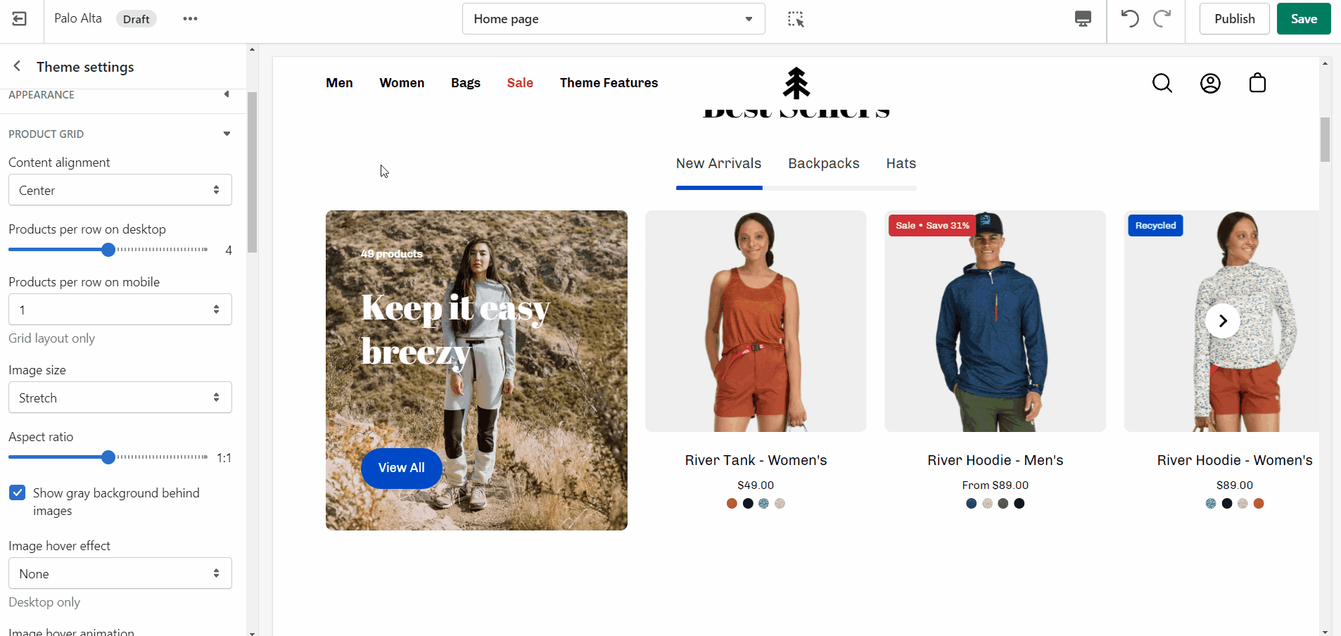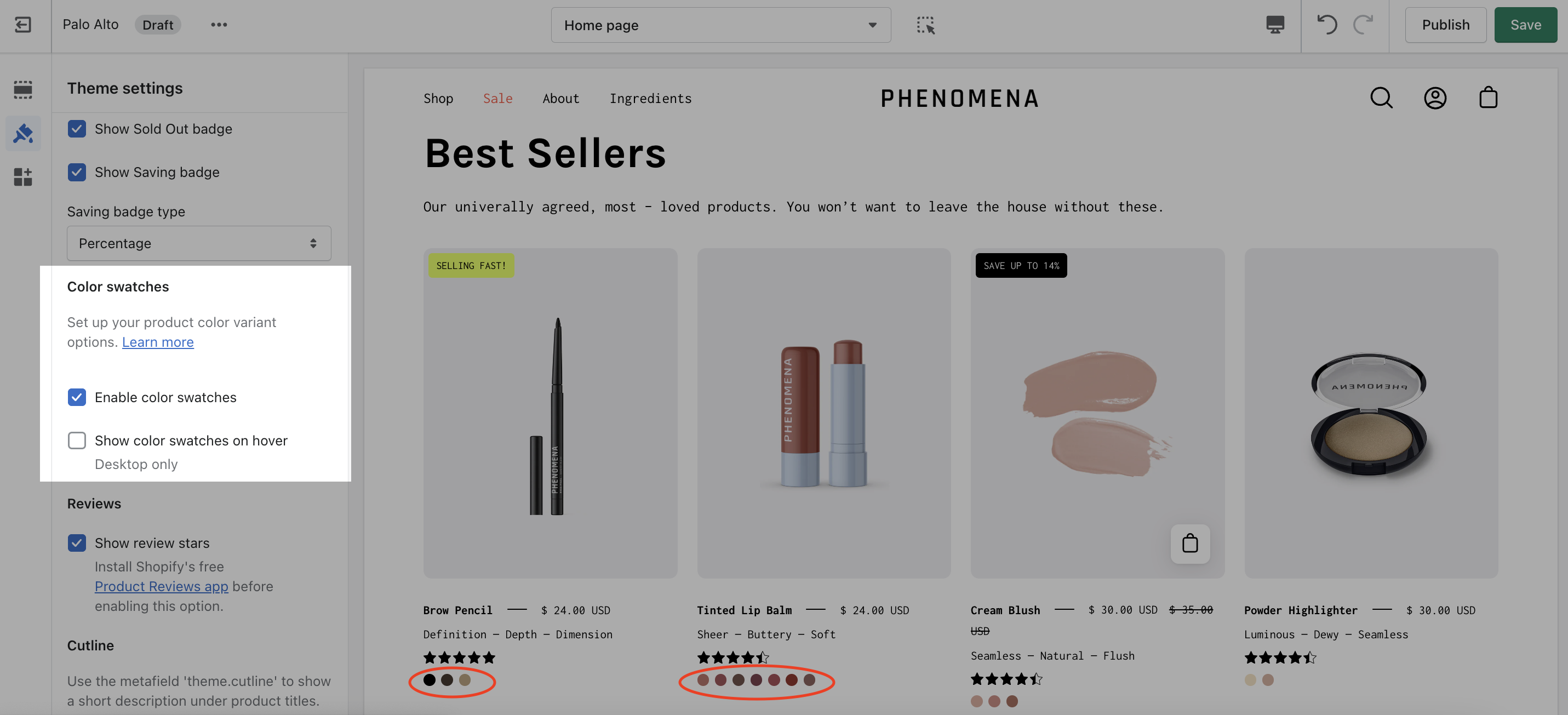 Under **Swatches**, you can toggle color swatches and enable them to be shown on hover (on Desktop only).
