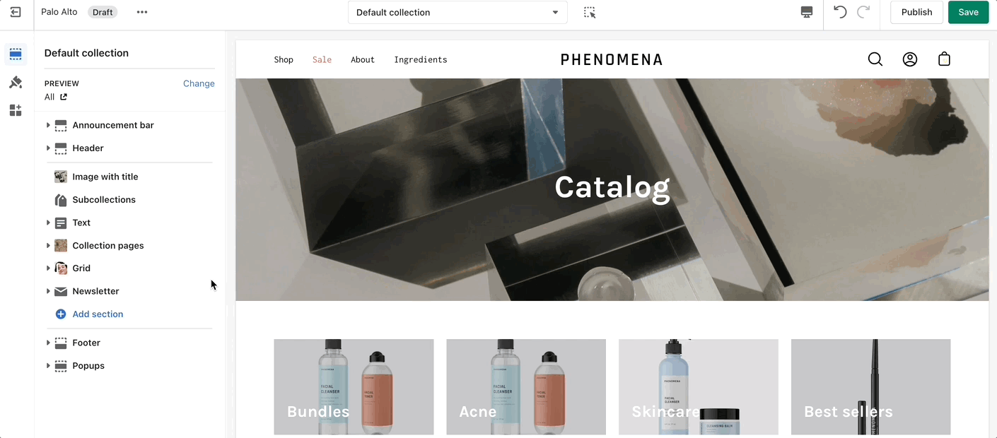 Palo Alto uses Shopify's Navigation menu system to bring custom menu items into any collection page and displays them as sub-collections with a graphical image, collection name, description, and link.