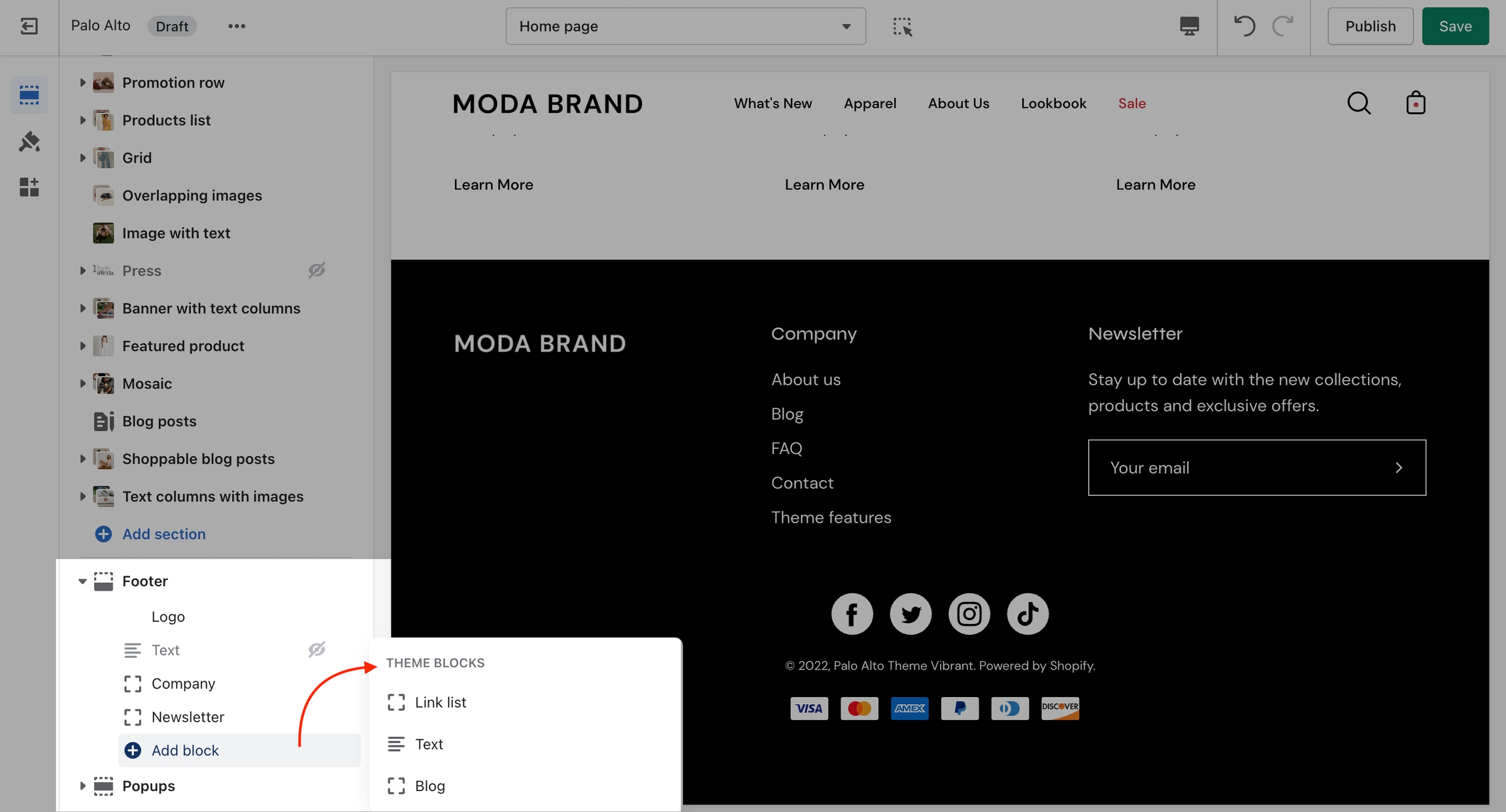 The Footer in Palo Alto has customizable elements in the form of section blocks. You can add in blocks by clicking the small arrow icon next to the Footer section then clicking the 'Add block' buttons:
