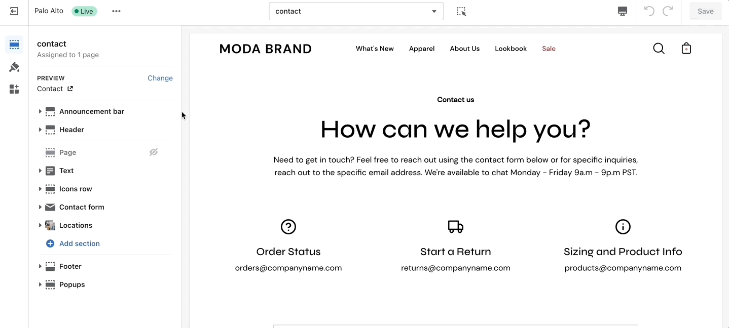 You can start customizing the page with the pre-defined sections included in Palo Alto. You can hide, reorder, remove sections that are included and also add any new selection from Palo Alto's list of over 25+ sections.