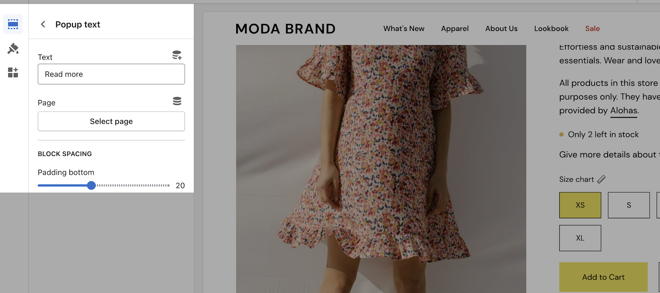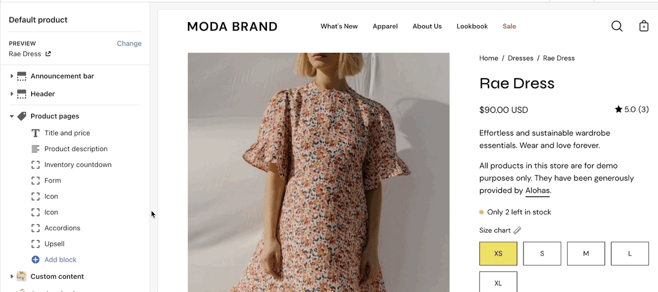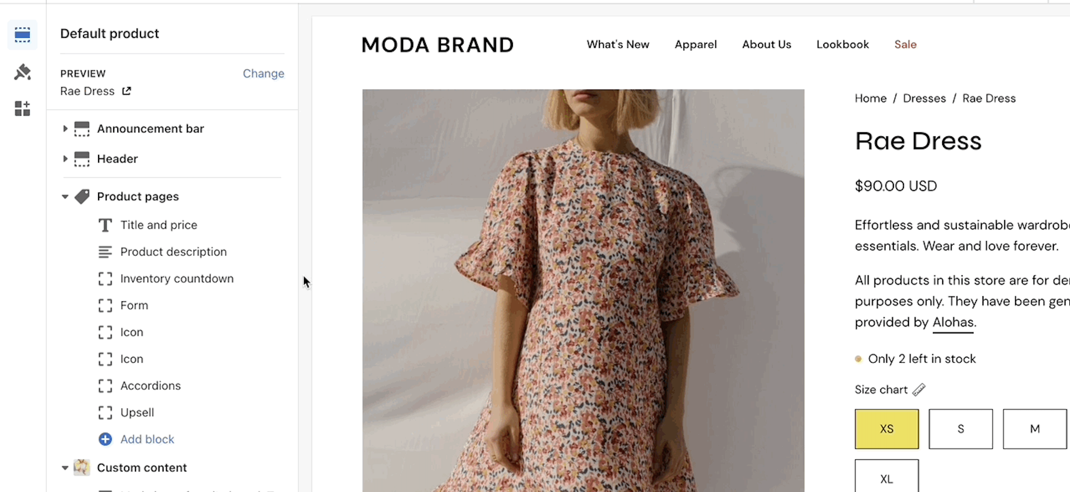 The Palo Alto 'Product pages' section blocks help you customize the primary or core content for your product pages and product templates. Adding sections further enhances your merchandising.