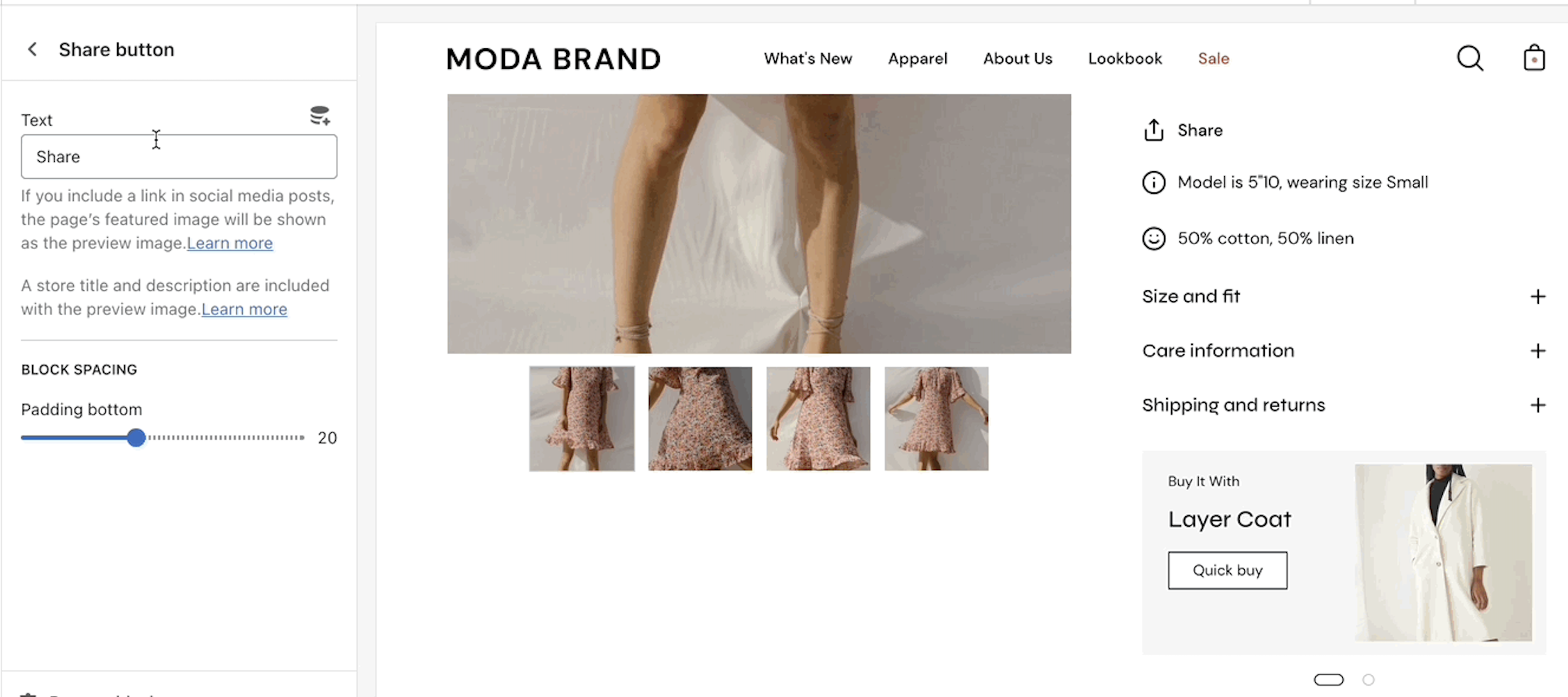<table data-view="cards"><thead><tr><th></th><th></th><th data-hidden data-card-target data-type="content-ref"></th><th data-hidden data-card-cover data-type="files"></th></tr></thead><tbody><tr><td><strong>Title and price</strong></td><td>Displays product price, title, and star rating.</td><td><a href="theme-blocks/title-and-price">title-and-price</a></td><td><a href="https://content.gitbook.com/content/gUj9I64rg9rJd0HEiLkG/blobs/Q3XqOAFT3827FFjJHn80/title-blocks.png">title-blocks.png</a></td></tr><tr><td><strong>Form</strong></td><td>Displays all buying-related elements.</td><td><a href="theme-blocks/form">form</a></td><td><a href="https://content.gitbook.com/content/gUj9I64rg9rJd0HEiLkG/blobs/OgMj4bcE24cOWwbNSUAn/form-blocks.png">form-blocks.png</a></td></tr><tr><td><strong>Product description</strong></td><td>Show the product description text.</td><td><a href="theme-blocks/product-description">product-description</a></td><td><a href="https://content.gitbook.com/content/gUj9I64rg9rJd0HEiLkG/blobs/GYcNmqrBXyhYO2A4R5Gf/product-description-blocks.png">product-description-blocks.png</a></td></tr><tr><td><strong>Accordions</strong></td><td>Create customizable tabs.</td><td><a href="theme-blocks/accordions">accordions</a></td><td><a href="https://content.gitbook.com/content/gUj9I64rg9rJd0HEiLkG/blobs/FvvomuKBNCziRP774mbX/accordions-blocks.png">accordions-blocks.png</a></td></tr><tr><td><strong>Upsell</strong></td><td>Display an upsell product on your page and in the cart.</td><td><a href="theme-blocks/upsell">upsell</a></td><td><a href="https://content.gitbook.com/content/gUj9I64rg9rJd0HEiLkG/blobs/VCUxelFH1AtP9Sdm2MBz/upsell-blocks.png">upsell-blocks.png</a></td></tr><tr><td><strong>Share button</strong></td><td>Displays a share icon for sharing the current product page on social media platforms.</td><td><a href="theme-blocks/share-button">share-button</a></td><td><a href="https://content.gitbook.com/content/gUj9I64rg9rJd0HEiLkG/blobs/SdAxn9GwlLCNMM9cKViu/share-blocks.png">share-blocks.png</a></td></tr><tr><td><strong>Text</strong></td><td>Add more details about your products.</td><td><a href="theme-blocks/text">text</a></td><td><a href="https://content.gitbook.com/content/gUj9I64rg9rJd0HEiLkG/blobs/ccp2ciHQ5AteMPXQmyn5/text-blocks.png">text-blocks.png</a></td></tr><tr><td><strong>Icon</strong></td><td>Add bits of information with icons.</td><td><a href="theme-blocks/icon">icon</a></td><td><a href="https://content.gitbook.com/content/gUj9I64rg9rJd0HEiLkG/blobs/NzrEuH8MnF0hEqhRnPDe/icons-blocks.png">icons-blocks.png</a></td></tr><tr><td><strong>Icon row</strong></td><td>Show multiple icons inside your product details section.</td><td><a href="theme-blocks/icon-row">icon-row</a></td><td><a href="https://content.gitbook.com/content/gUj9I64rg9rJd0HEiLkG/blobs/5V3SFNQ1b8YPtAVWgFCF/icon-row-blocks.png">icon-row-blocks.png</a></td></tr><tr><td><strong>Inventory countdown</strong></td><td>Display a notification about the current inventory quantity.</td><td><a href="theme-blocks/inventory-countdown">inventory-countdown</a></td><td><a href="https://content.gitbook.com/content/gUj9I64rg9rJd0HEiLkG/blobs/XYH9bAktvg3sq67bhKMs/inventory-blocks.png">inventory-blocks.png</a></td></tr><tr><td><strong>Popup text</strong></td><td>Create a slide-out block with extra text.</td><td><a href="theme-blocks/popup-text">popup-text</a></td><td><a href="https://content.gitbook.com/content/gUj9I64rg9rJd0HEiLkG/blobs/Bcfo1T3nNgRea1bMVpxg/popup-blocks.png">popup-blocks.png</a></td></tr><tr><td><strong>Divider</strong></td><td>A simple line with top and bottom spacing settings.</td><td><a href="theme-blocks/divider">divider</a></td><td><a href="https://content.gitbook.com/content/gUj9I64rg9rJd0HEiLkG/blobs/dZ2zHYScQTr6VVukxQt9/divider-blocks.png">divider-blocks.png</a></td></tr></tbody></table>