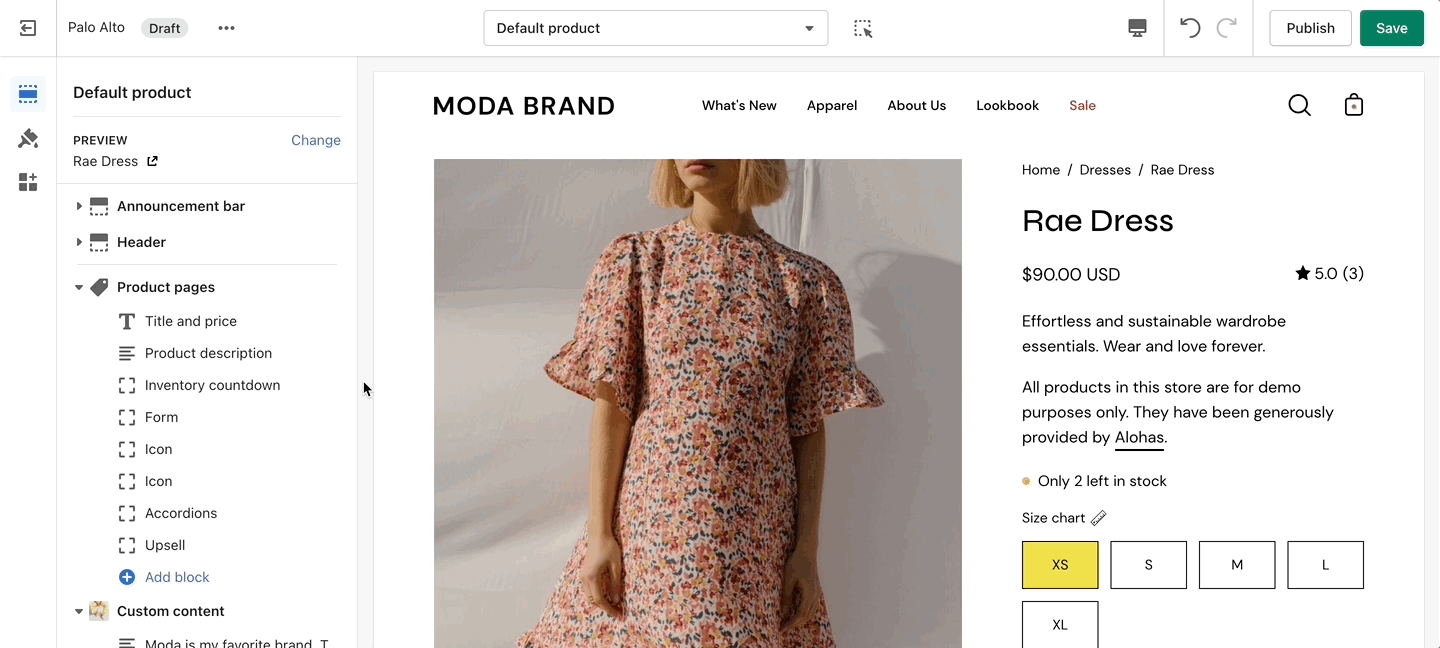 Displays all buying-related elements including product variants and swatches, quantity selector, the add to cart button, and the buy it now button.