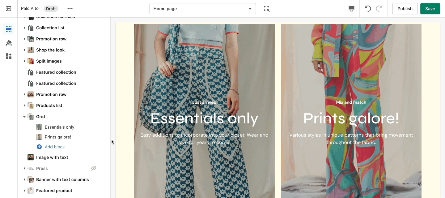 'Grid' allows you to bundle different blocks together to create your own layout. You can add a mix of collections, products, images, and text to make this section your own.