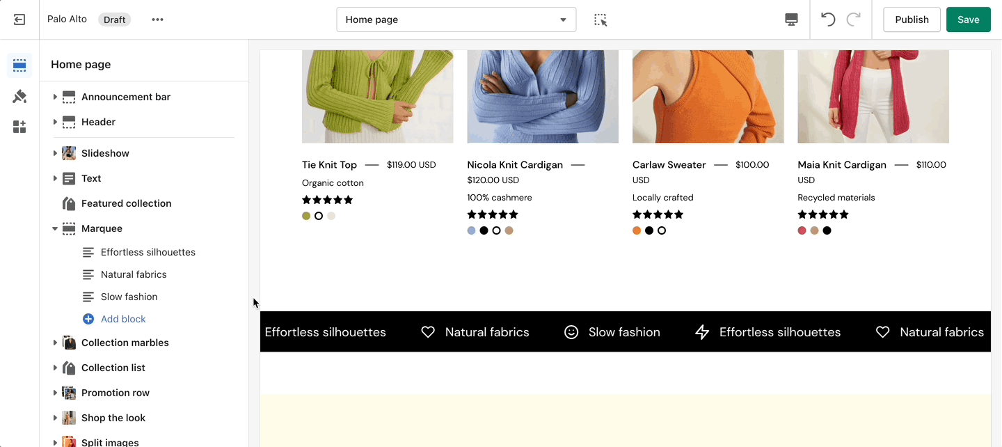 <figure><img src="https://content.gitbook.com/content/gUj9I64rg9rJd0HEiLkG/blobs/jy1K8PDp7UtvAjZVmGmV/marquee.gif" alt=""><figcaption><p>Add Text, Free shipping message, or a Custom HTML block</p></figcaption></figure>