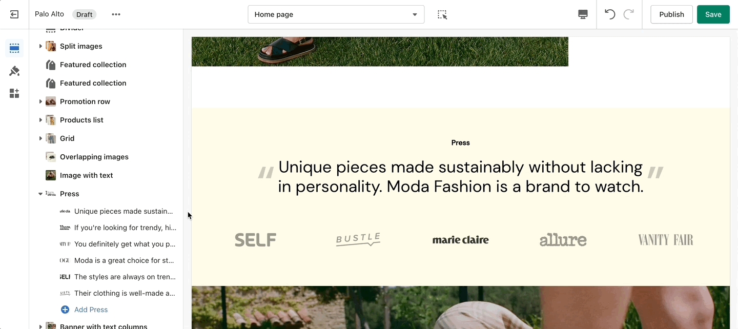 Add blocks by clicking on the small arrow next to the section then clicking 'Add block'.