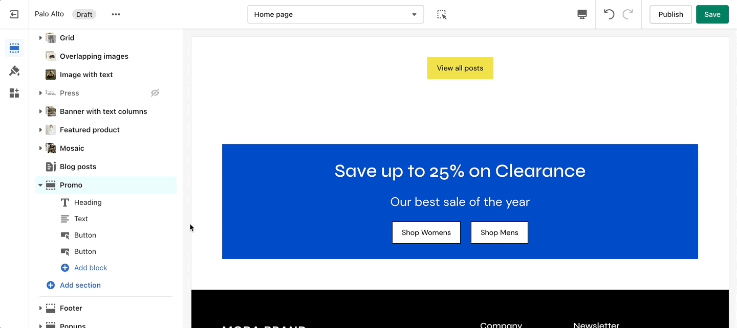Use the 'Promo' section to add a simple banner image with text and promote to customers as they scroll along the page.