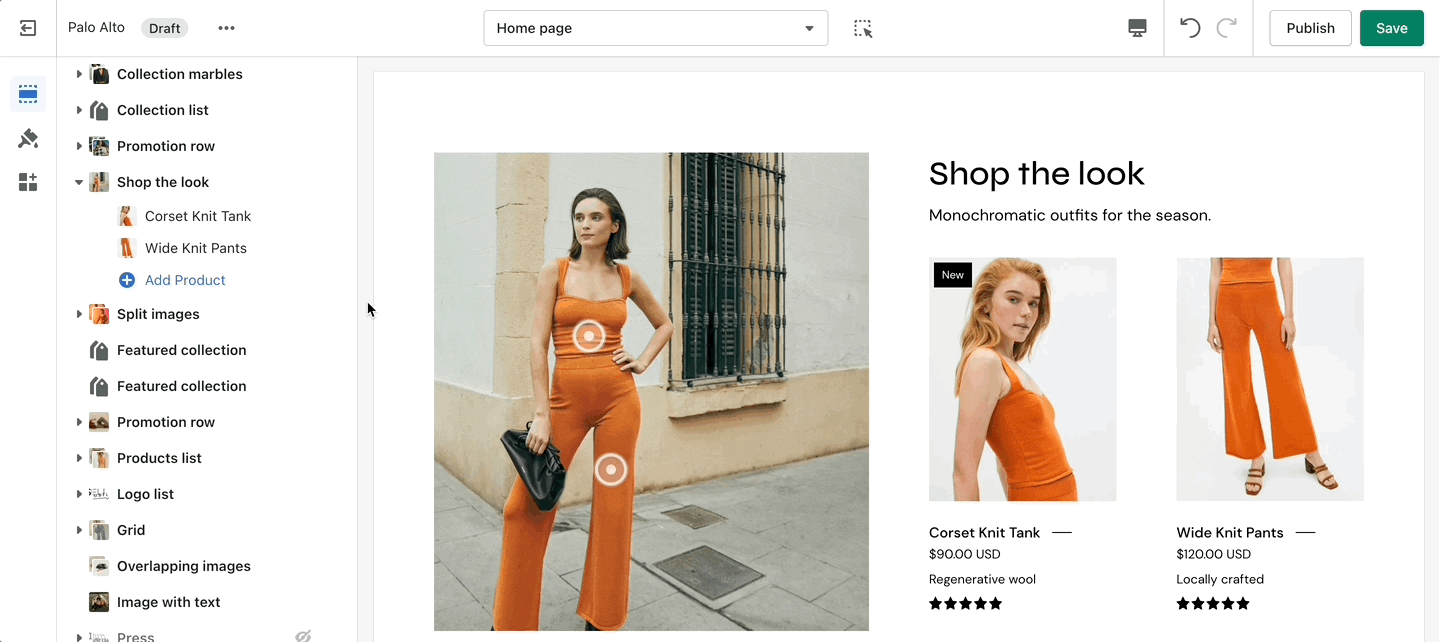 'Shop the look' allows you to use images and dots to highlight specific points of your products. Use this section to create a unique way of getting your customer's attention!