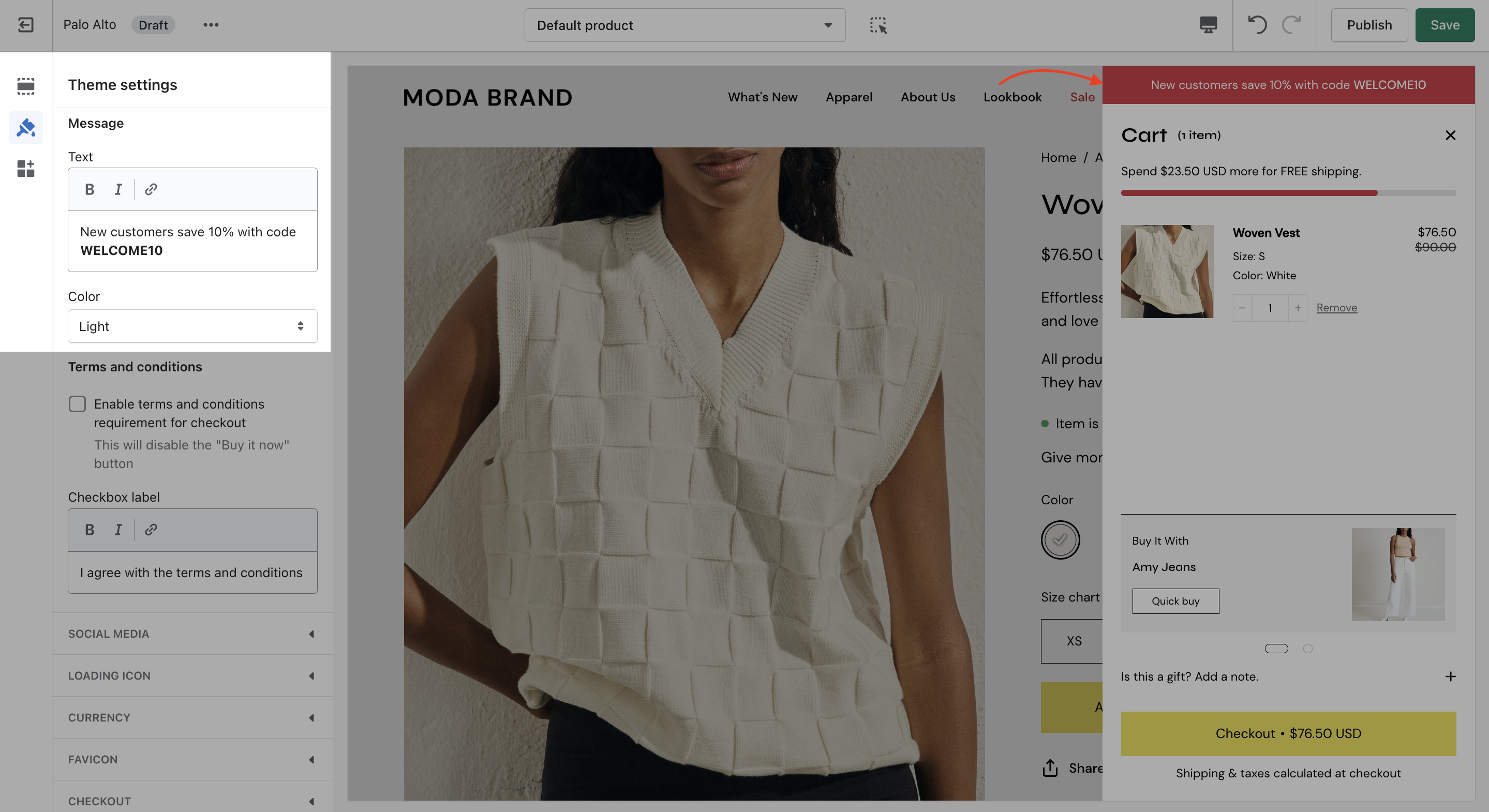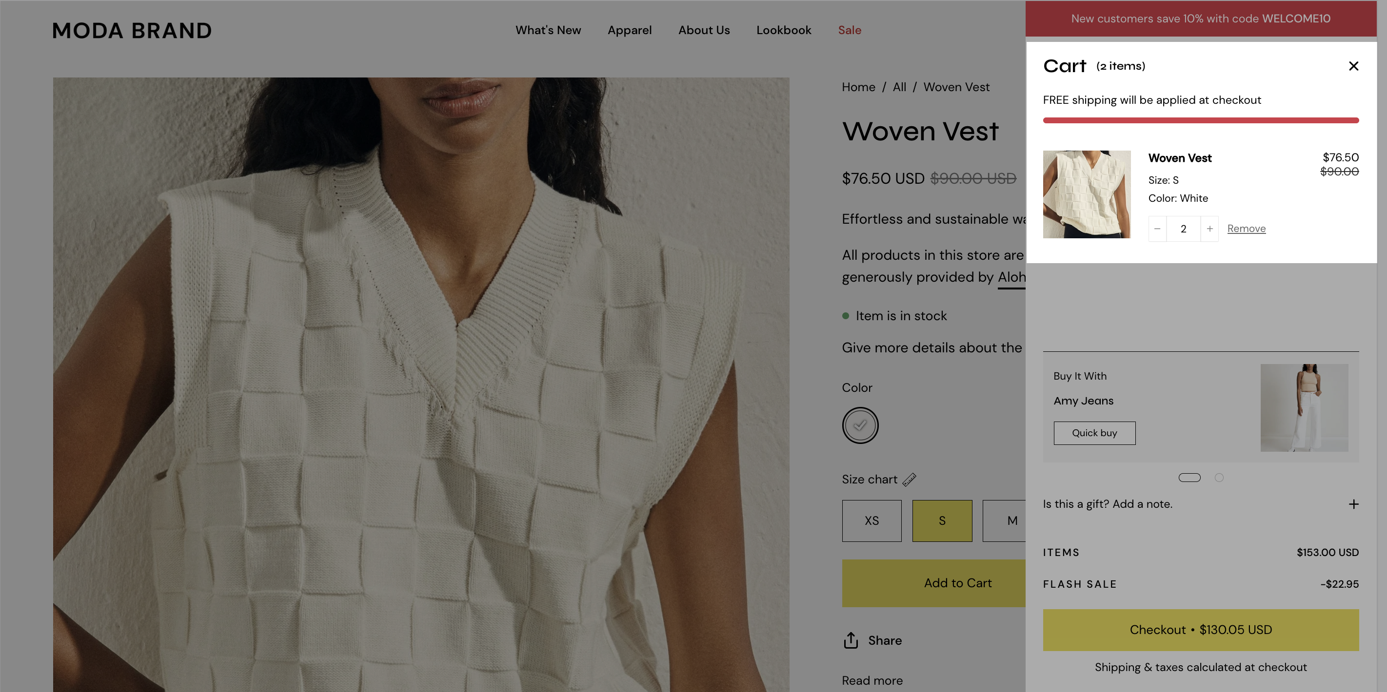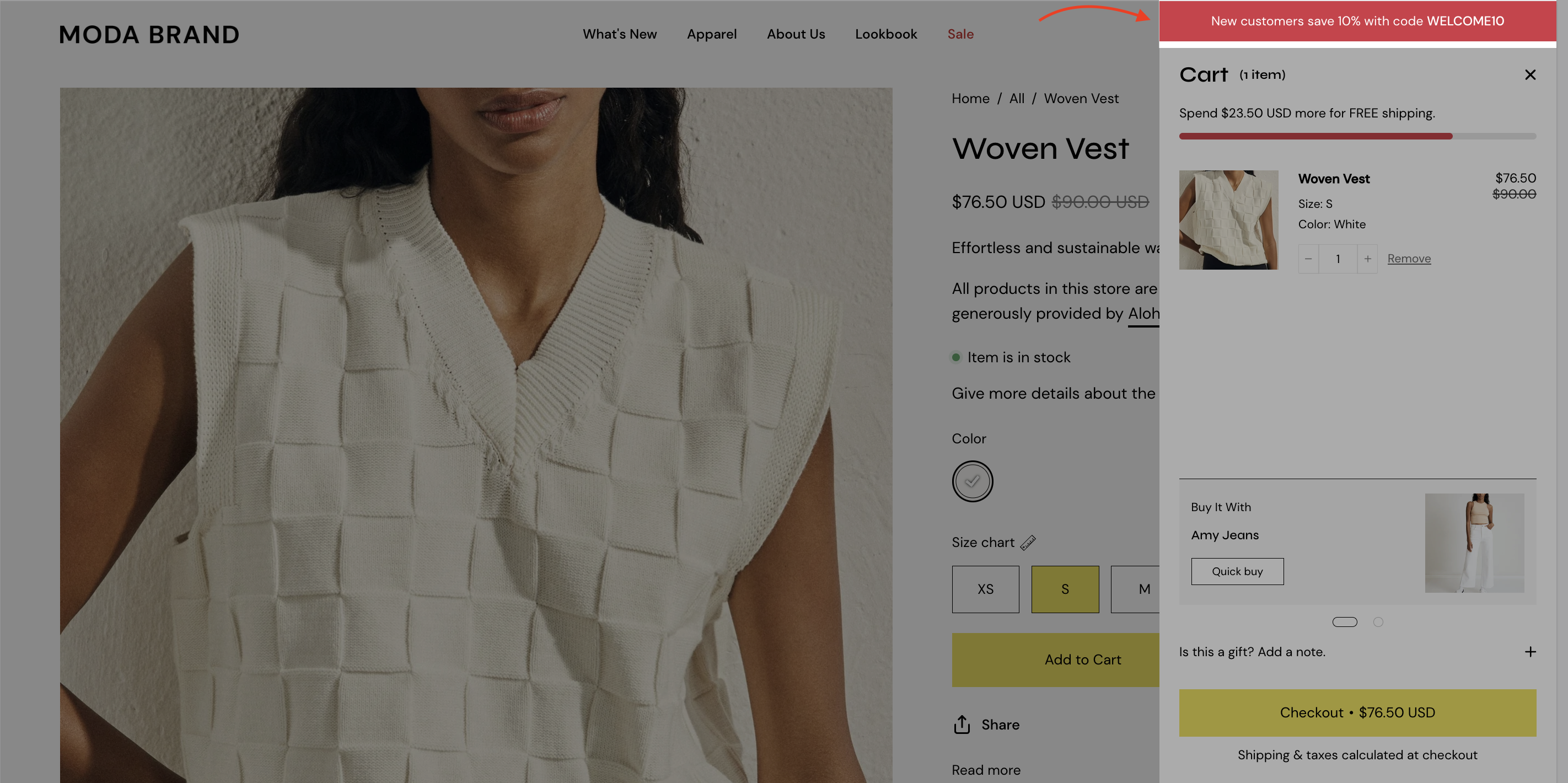 Add a free shipping message in the cart drawer to help your customers know how close they are to free shipping. The value fills up and changes as items are added to the cart.