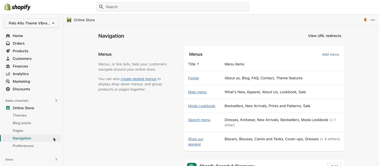 To set this up you need to first create a new navigation menu. Start by heading over to your Online Store > Navigation and clicking on '*Add menu*':