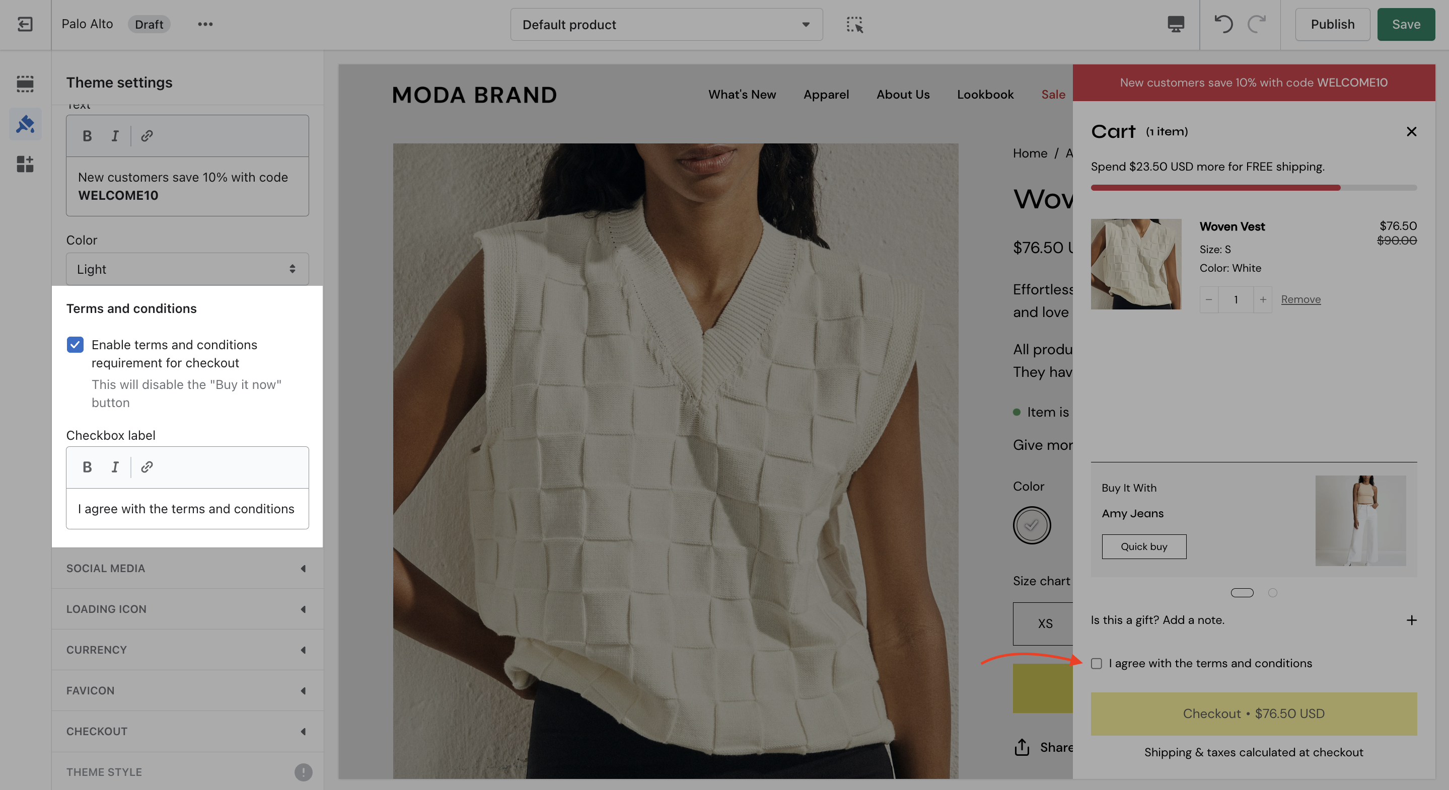 The cart terms and conditions allow you to add a checkbox to stop users from checking out before accepting the terms and conditions of your store.