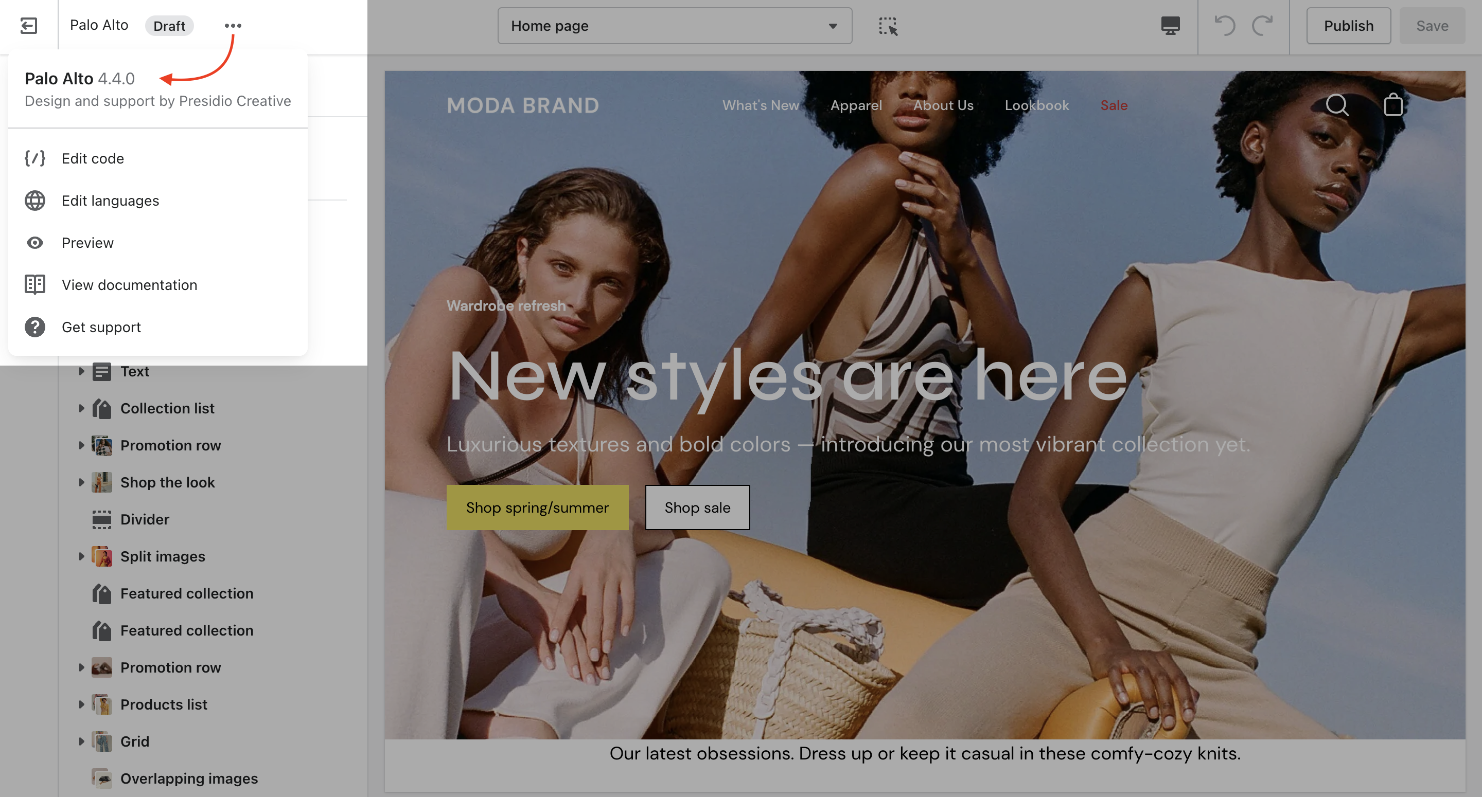 To check the version of your current copy of the Palo Alto theme, click on the ellipses (three dots) icon at the top of the Theme Editor to view theme actions including the version number.
