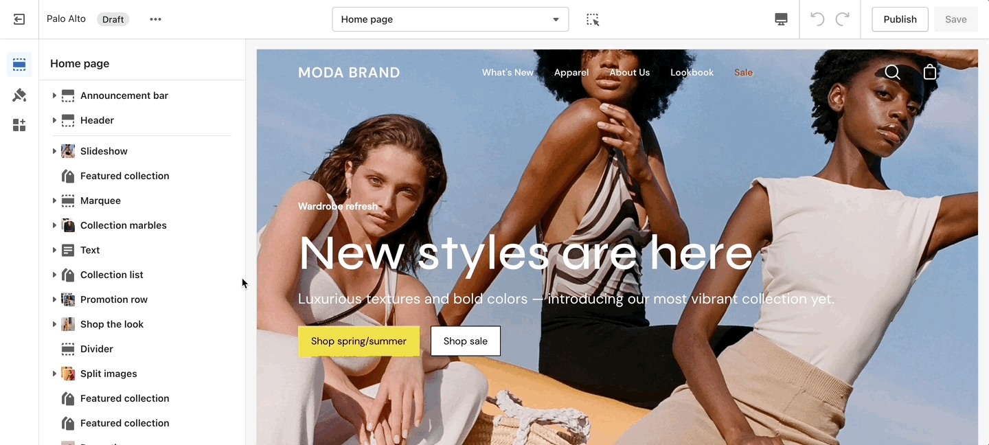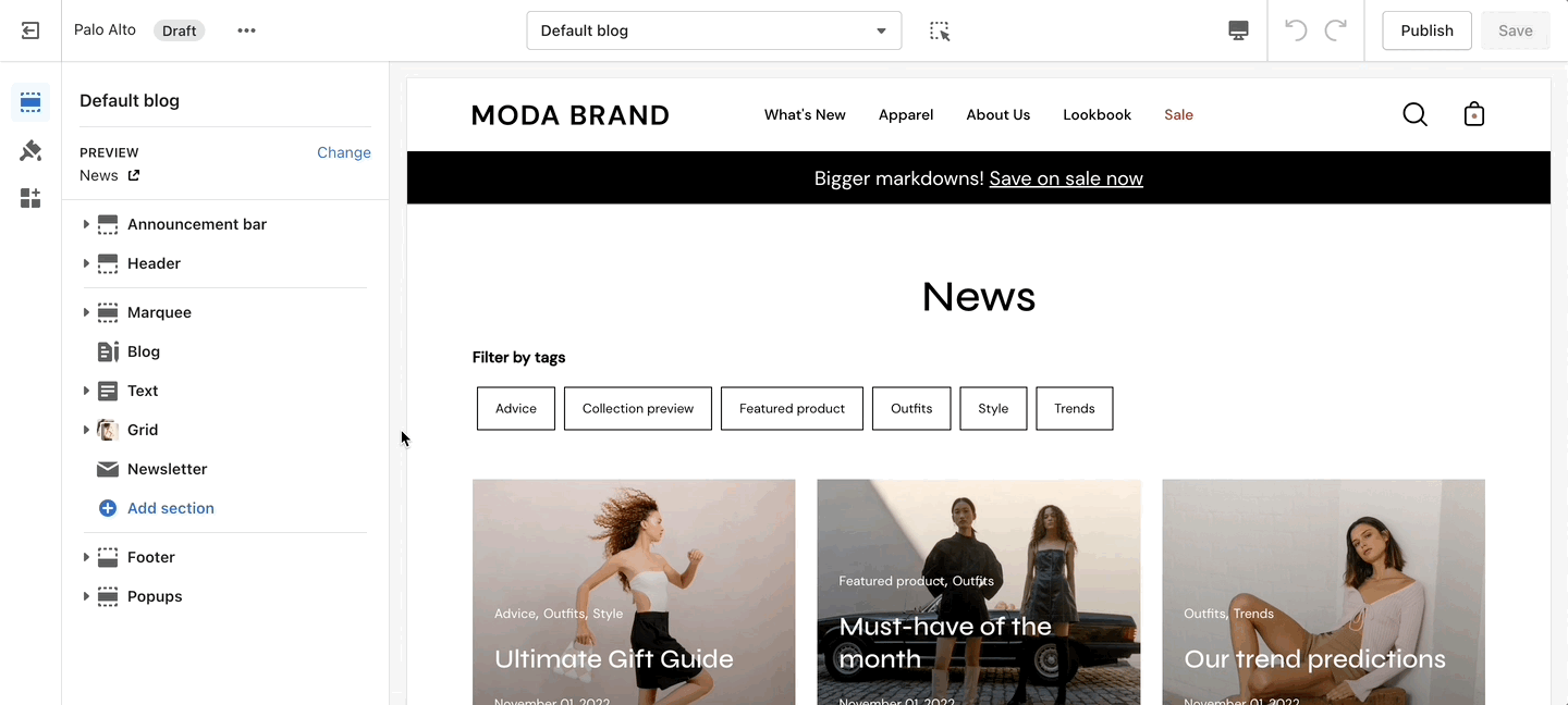Palo Alto displays a rich grid of all your blog post articles. Click on Blog pages to configure the layout of your blog index page.