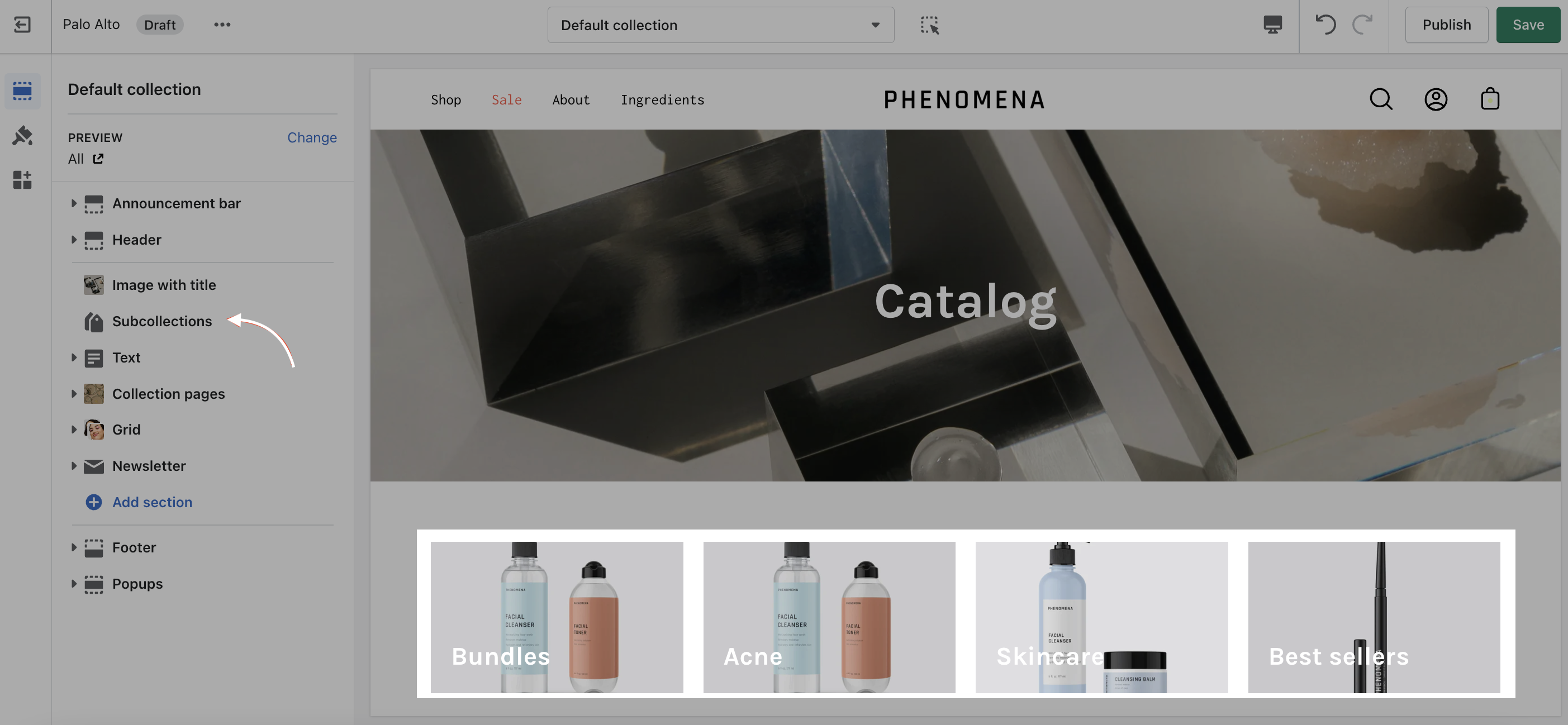 Palo Alto uses Shopify's Navigation menu system to bring custom menu items into any collection page and displays them as sub-collections with a graphical image, collection name, description, and link.