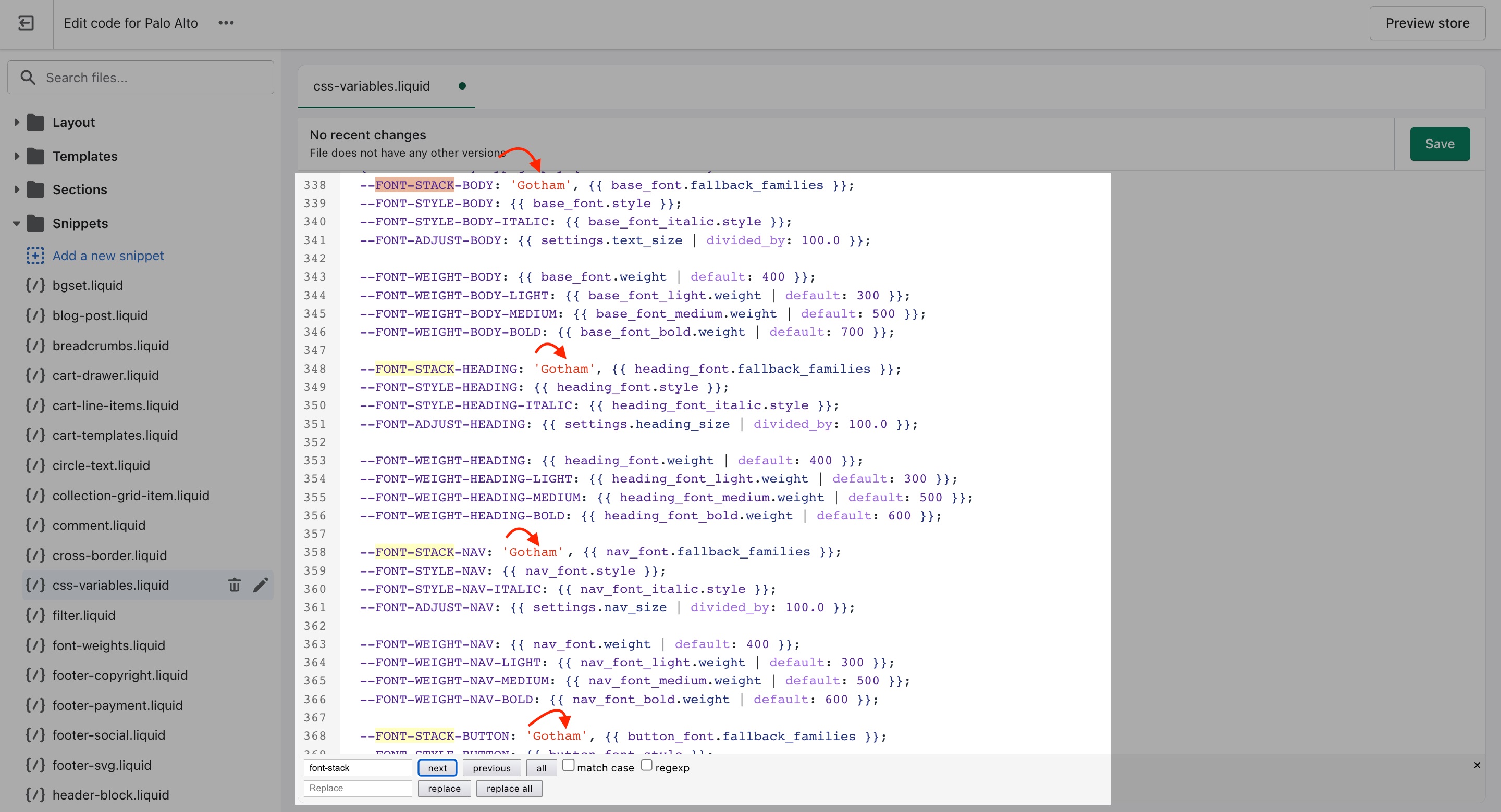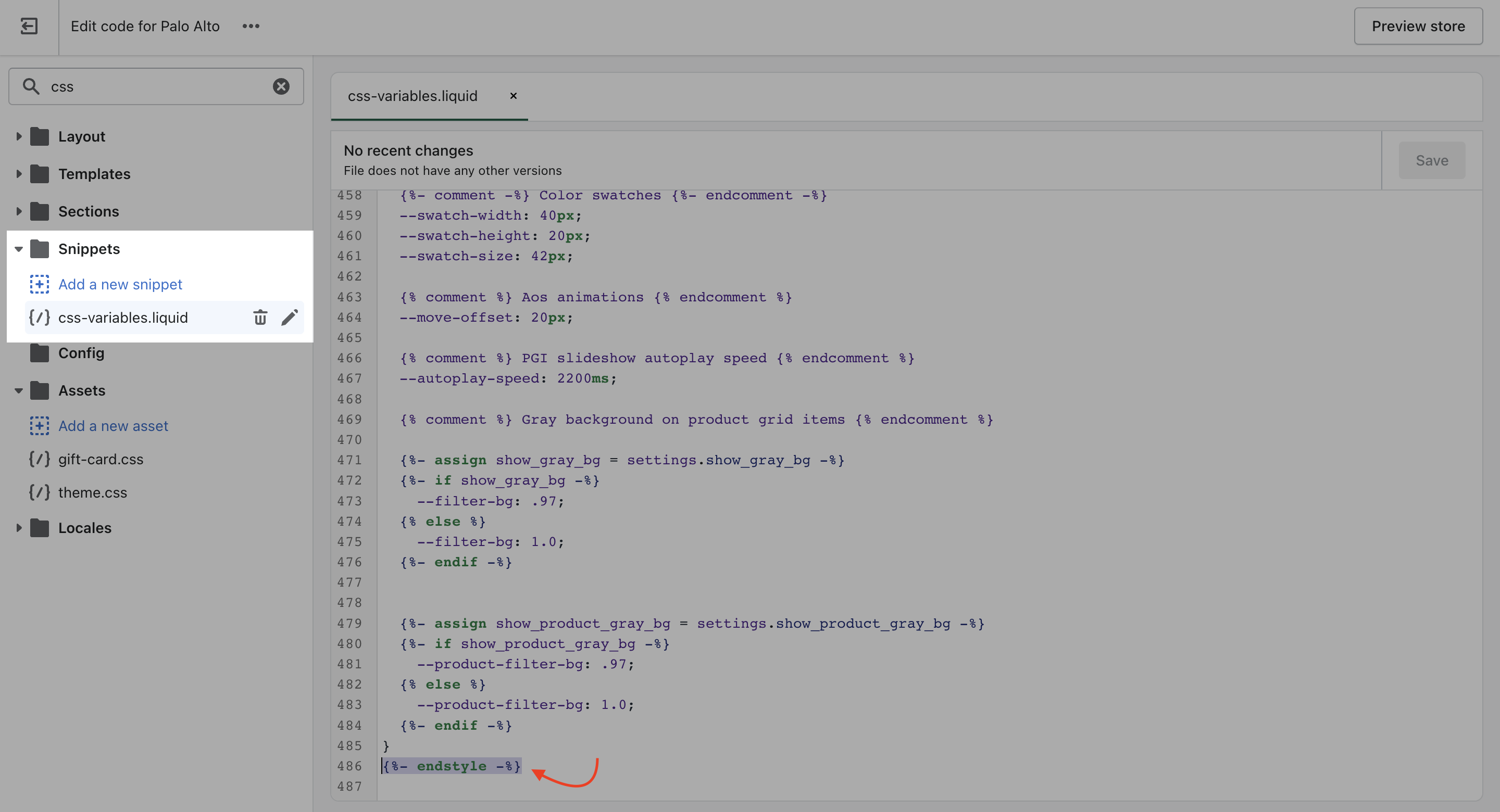 Now that we have the assets sorted out we can head on over to the '***css-variables.liquid***' file located in the **Snippets** folder.