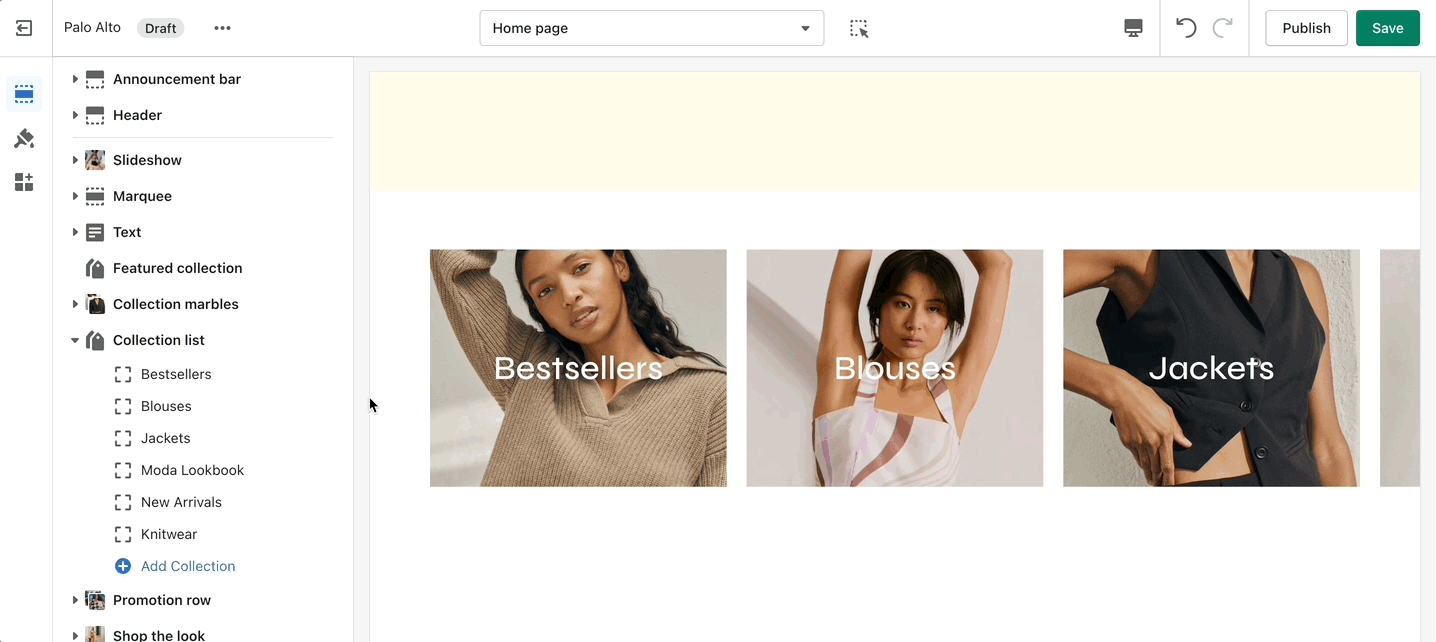 The 'Collection list' section is here to help you add links to collections you want to highlight on your store pages. This is a quick and easy way to run promotions or let your customers know about new collections.