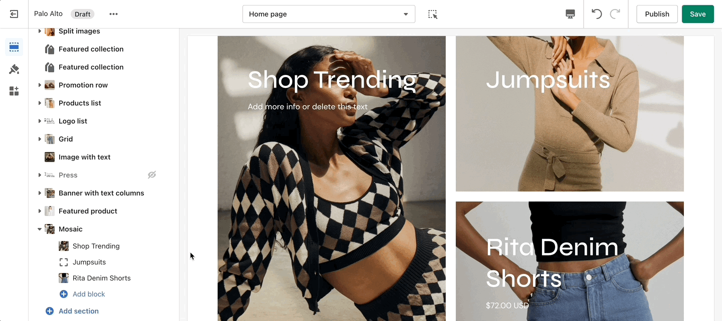 Add blocks by clicking on the small arrow next to the section then clicking 'Add block'