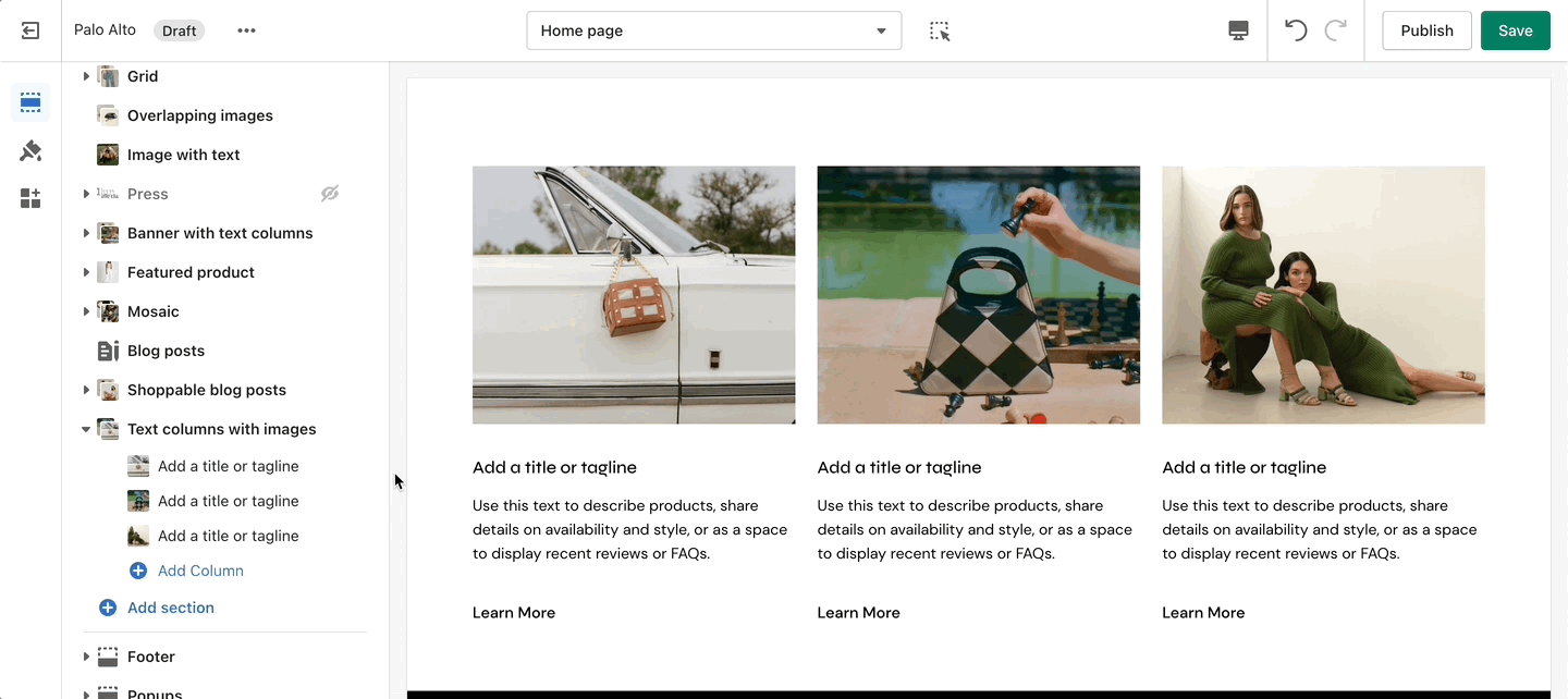 Inspired by the blog posts section, 'Text collums' allows you to create your own highlights from the theme editor without having the need to create blog posts.