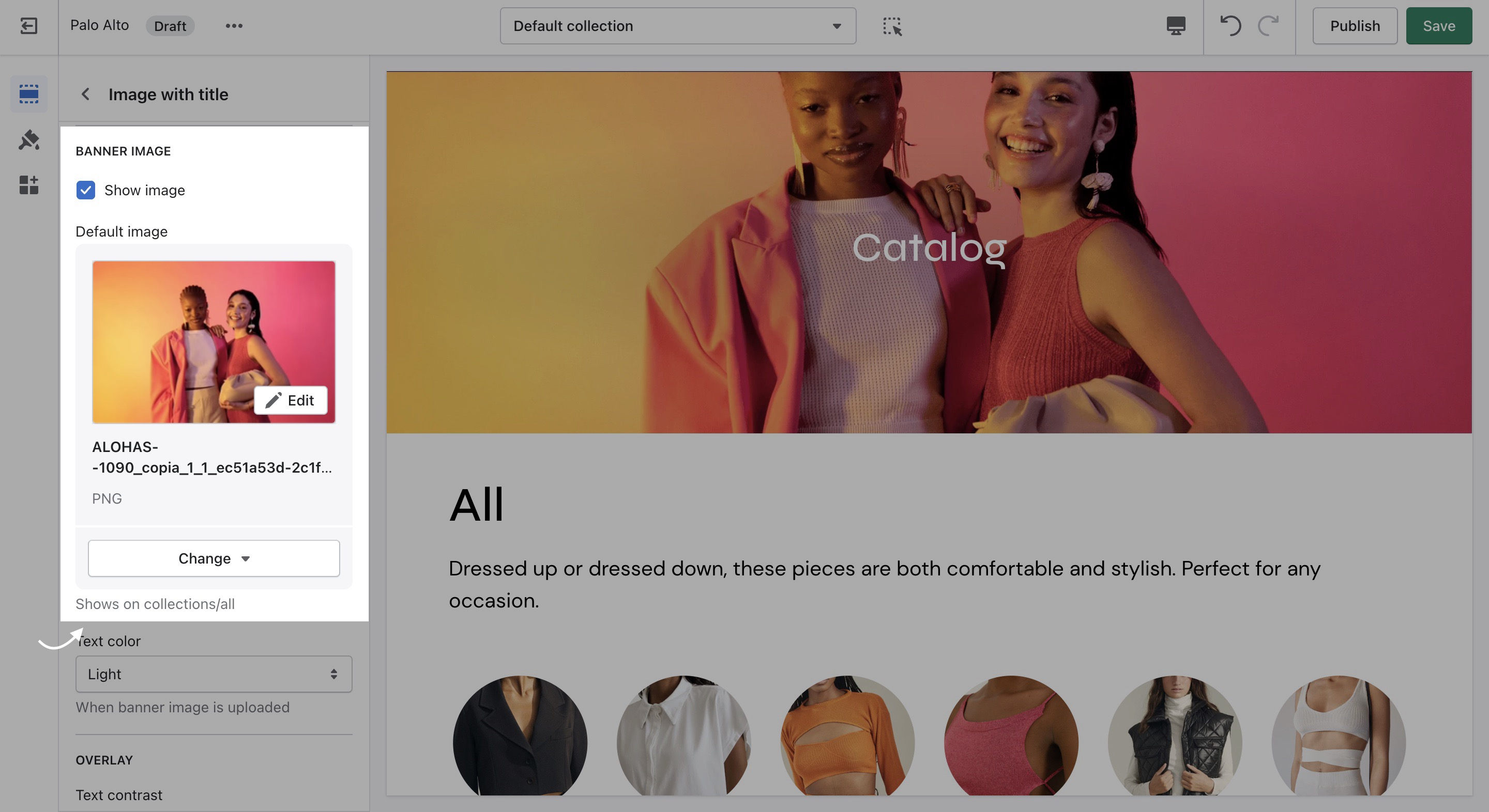 This is the page with the "/collections/all" URL that lists all of the visible products in the store. By default, products on the catalog page are shown in alphabetic order.&#x20;