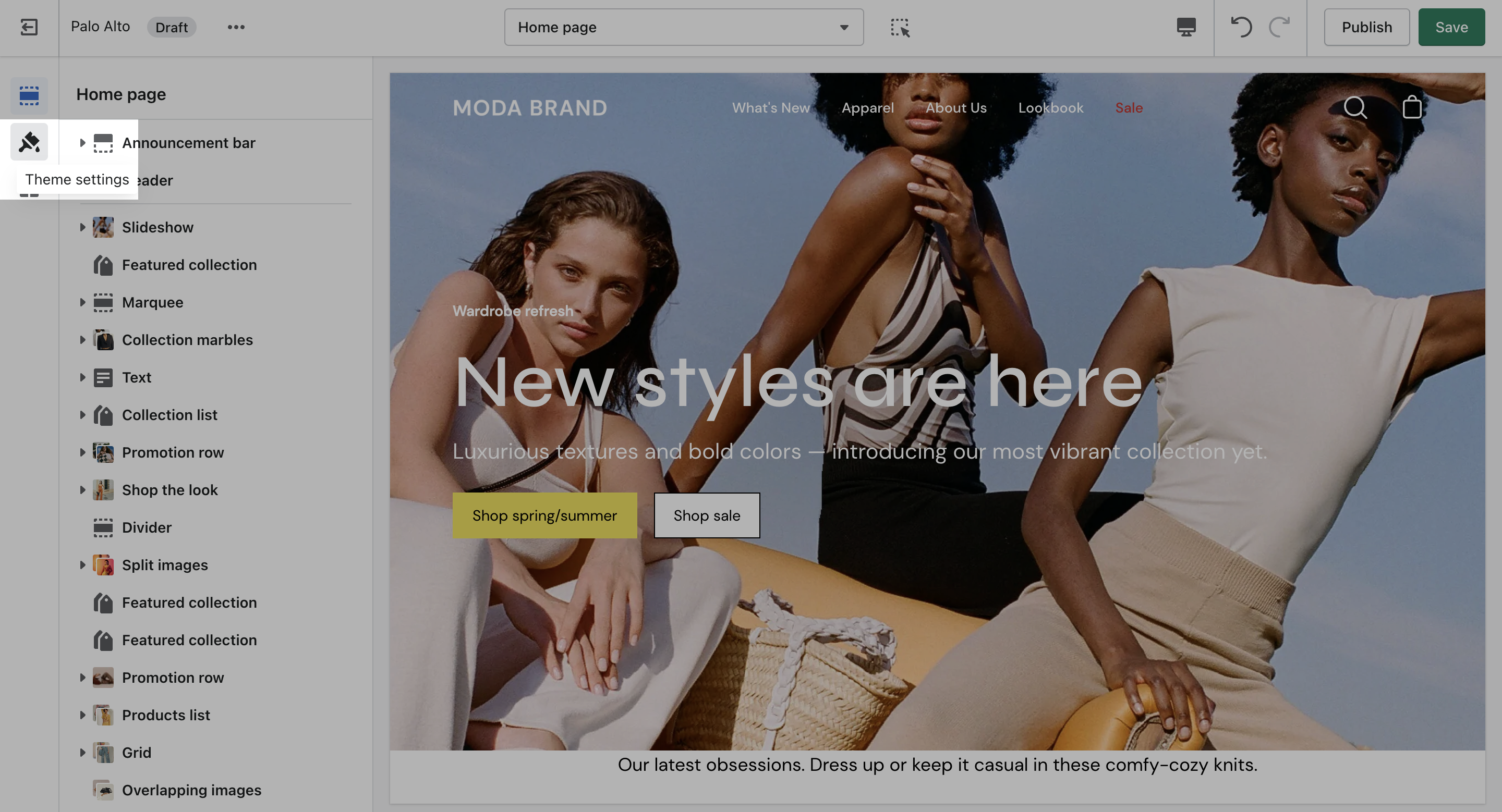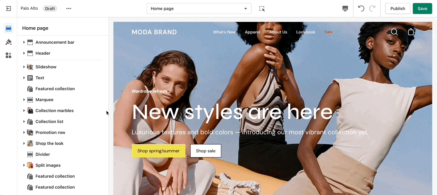 Palo Alto comes complete with 20+ professional theme sections to help you merchandise your online store. Sections can be added to any page on your store.