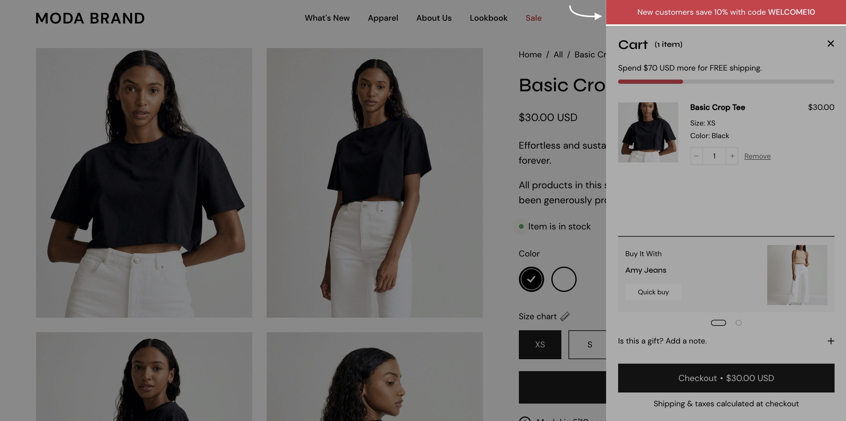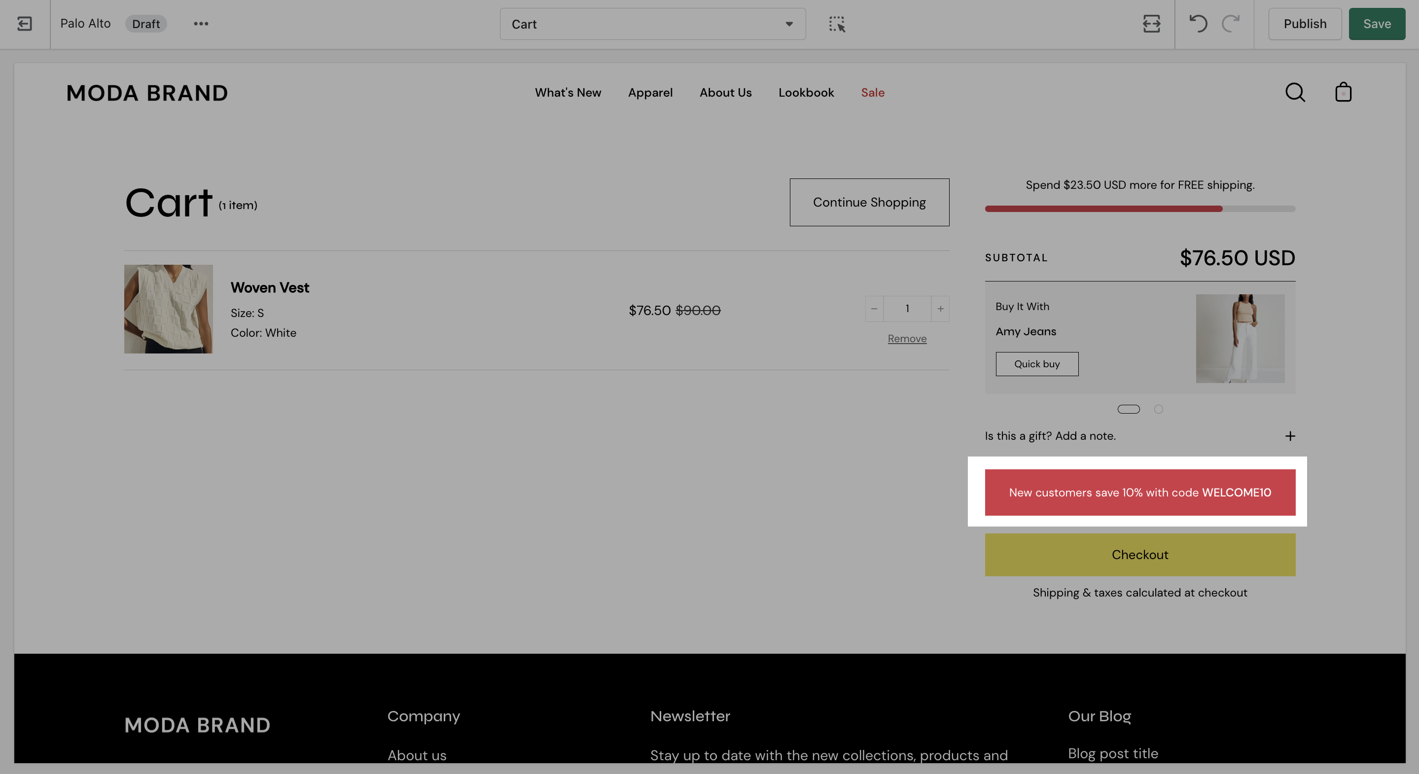 Add a free shipping message in the cart drawer to help your customers know how close they are to free shipping. The value fills up and changes as items are added to the cart.