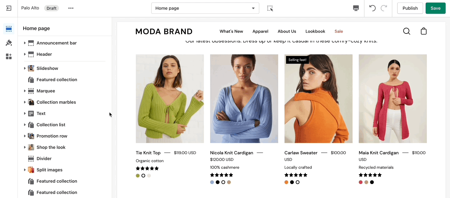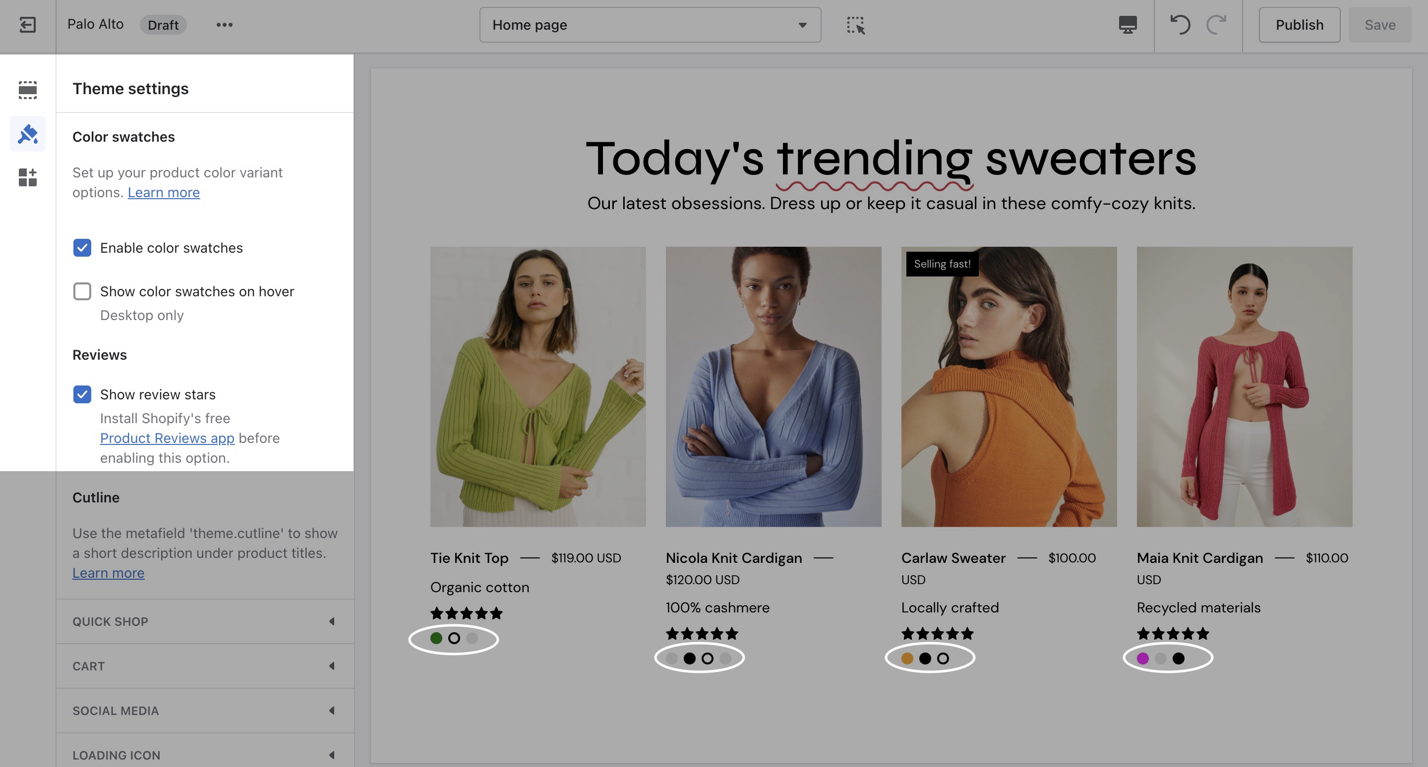 Under Swatches, you can toggle color swatches and enable them to be shown on hover (on Desktop only).
