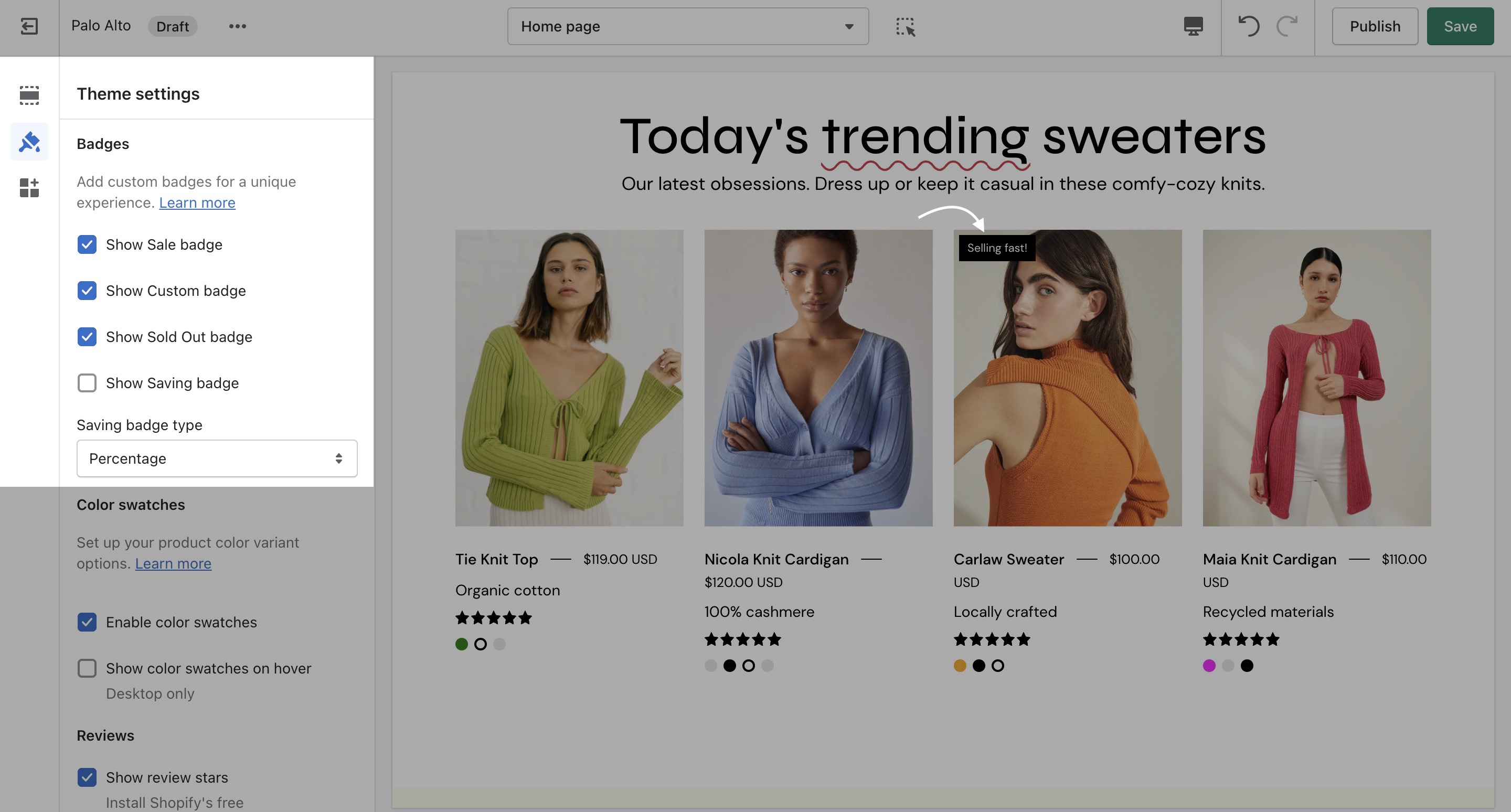 Under Badges, you can toggle the Sale, Custom, Sold out, and Savings badges. There is also the option to show savings in cash or as a percentage.