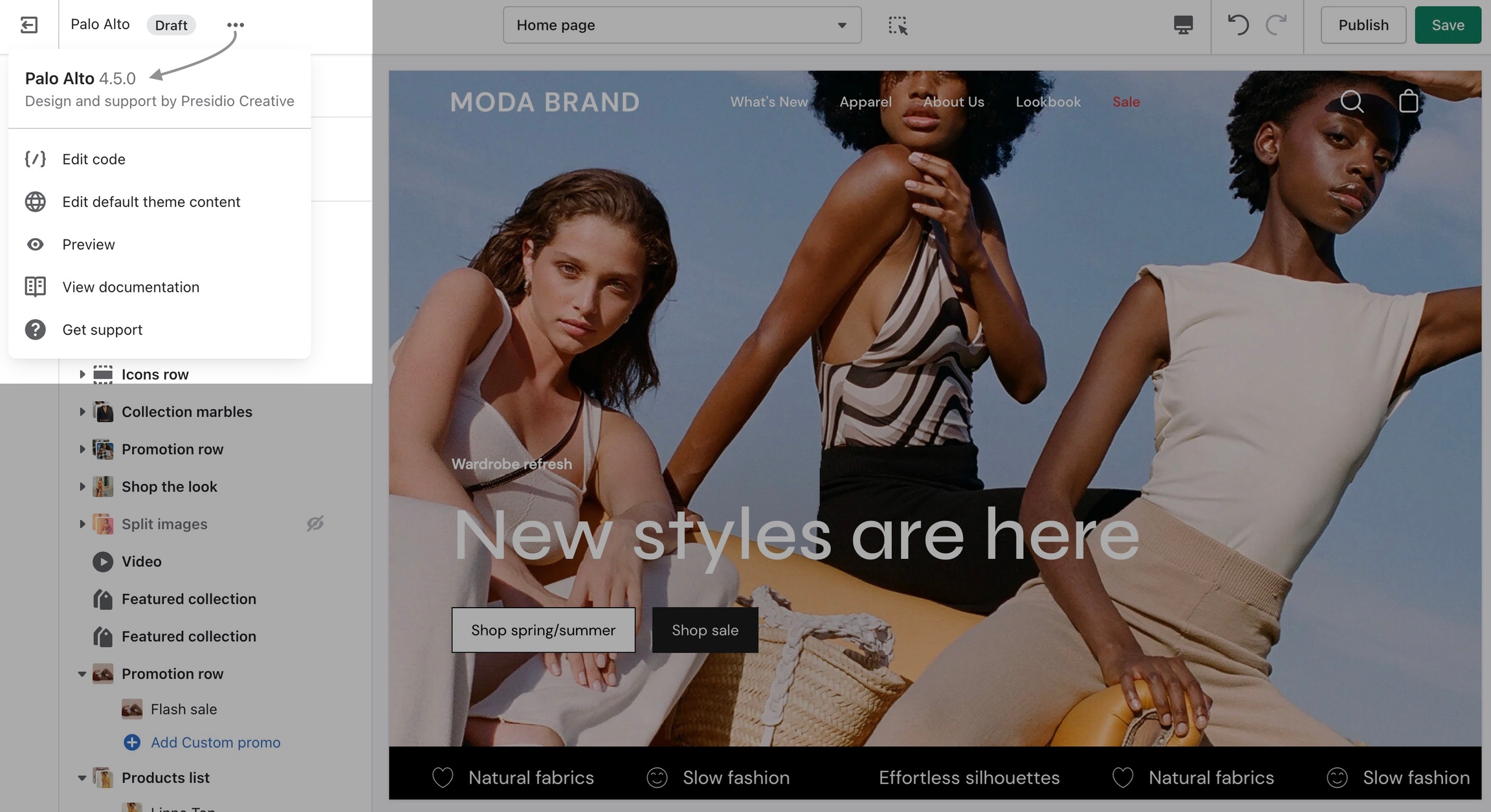 To check the version of your current copy of the Palo Alto theme, click on the ellipses (three dots) icon at the top of the Theme Editor to view theme actions including the version number.