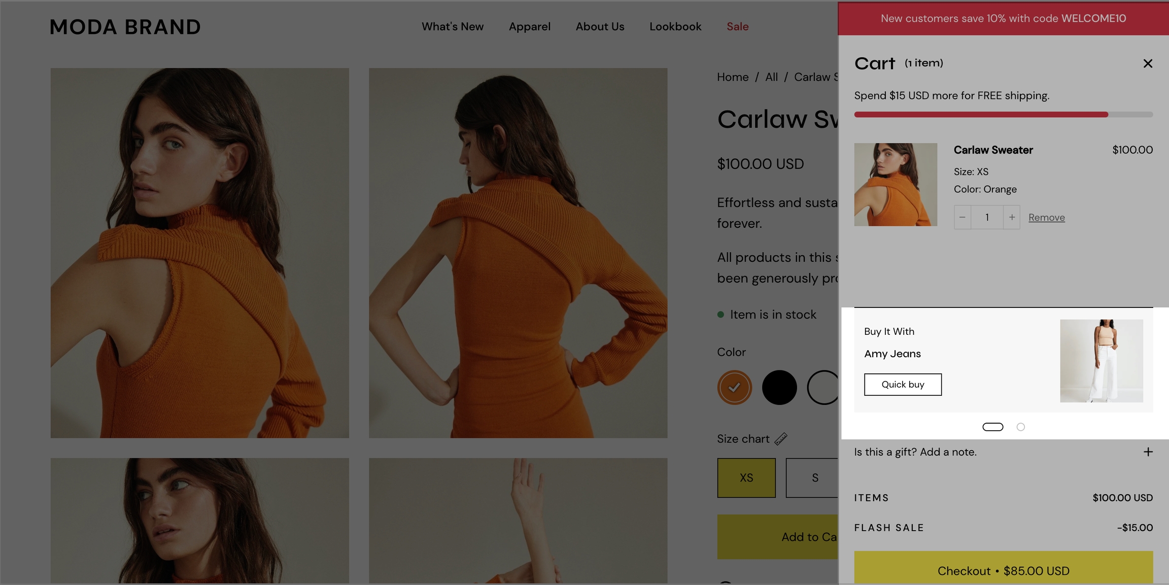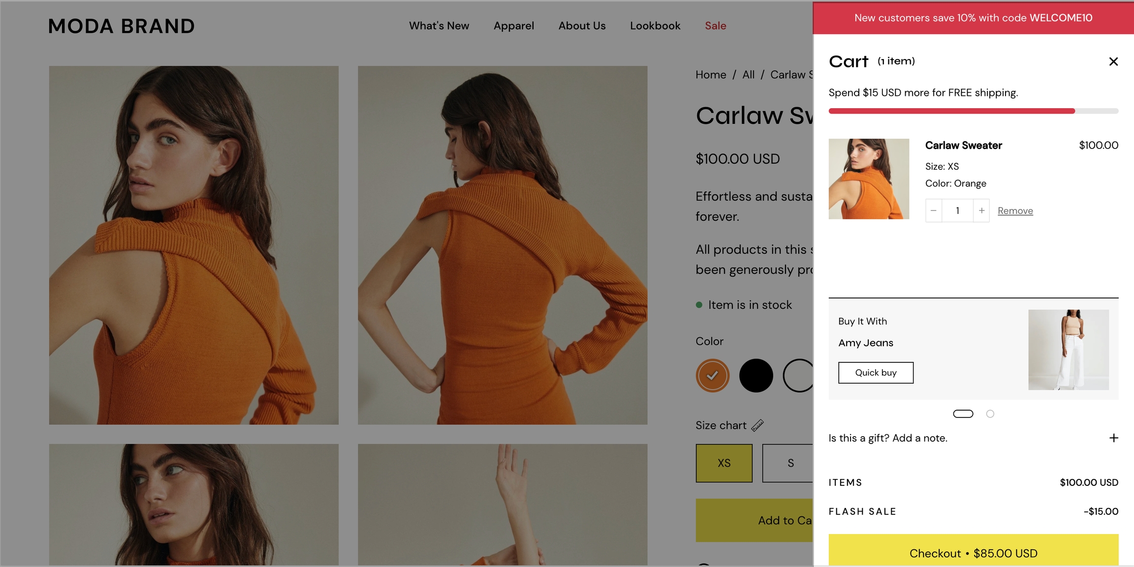 Add a free shipping message in the cart drawer to help your customers know how close they are to free shipping. The value fills up and changes as items are added to the cart.
