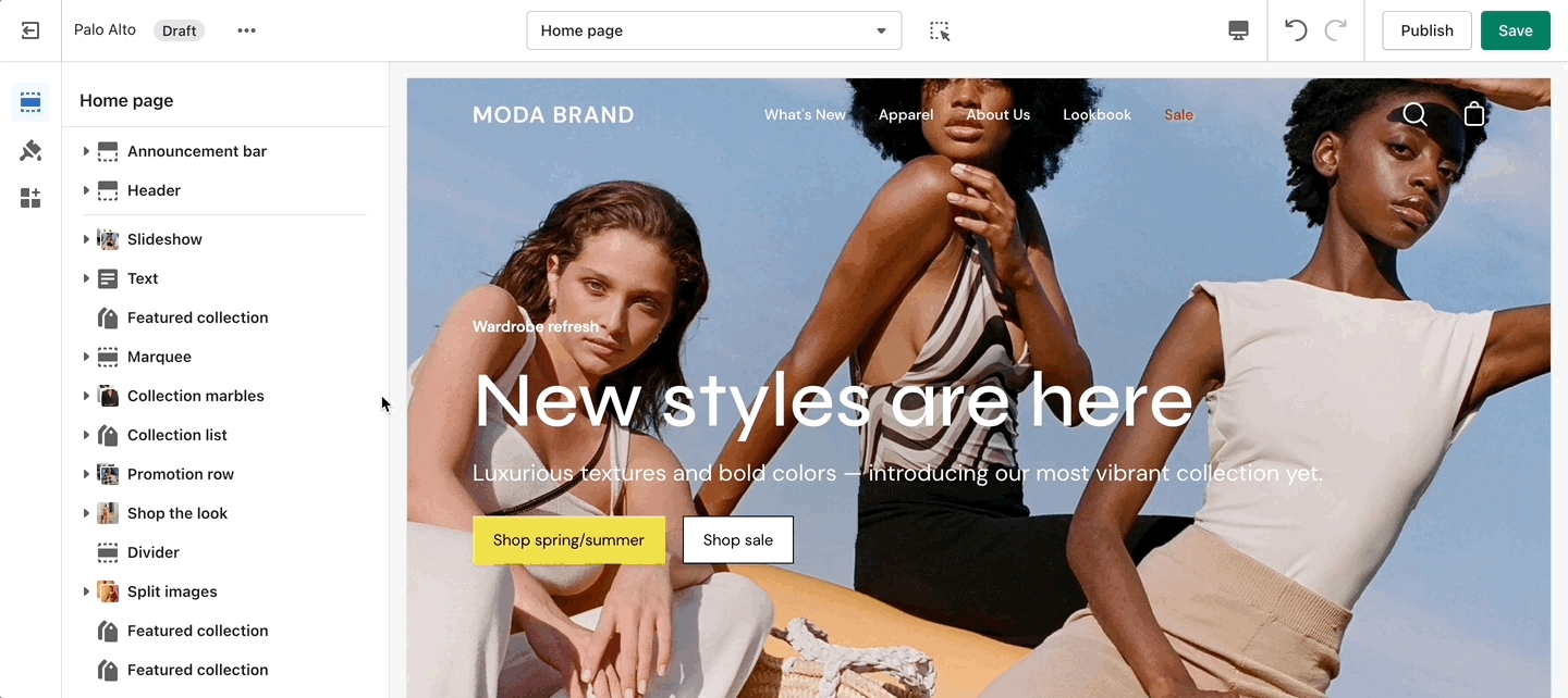 Palo Alto is built to use Shopify's Online Store 2.0 (OS2) which allows you to use all of Palo Alto's 20+ sections everywhere including the Homepage, Product pages, Collections, Pages, Blogs, Cart page, Search page, and more. Endless flexibility options for your store.