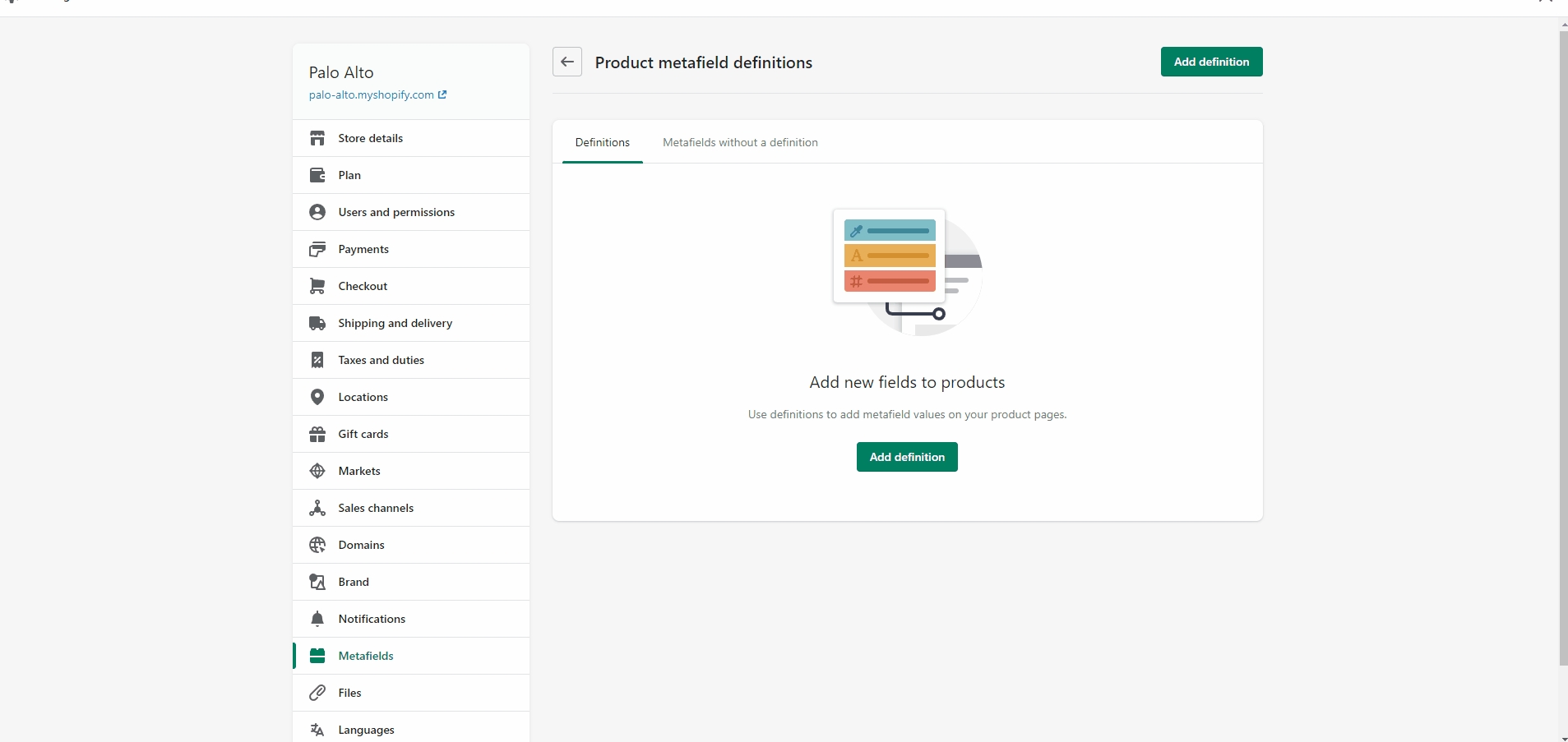 To start, navigate to your Shopify Admin -> Settings and choose Metafields from the left panel. Next, click on Products (click images to zoom):